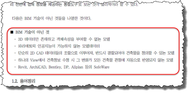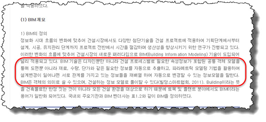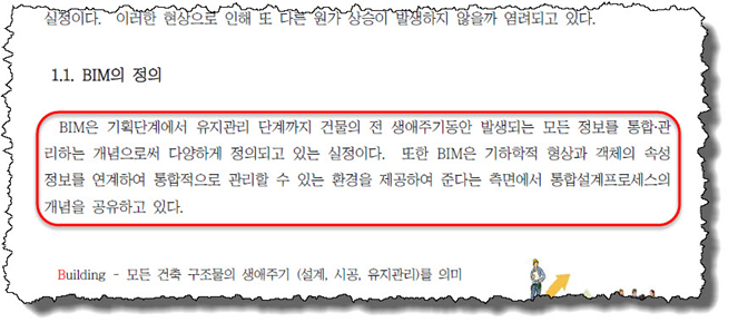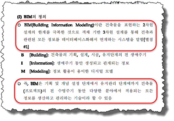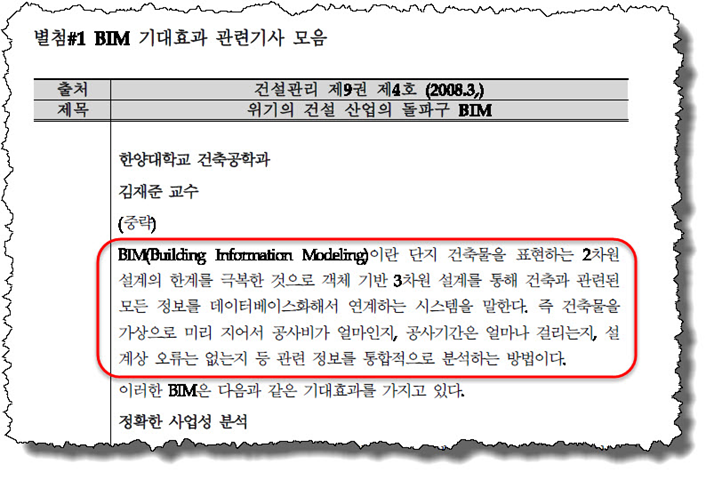 잘못된 정보가 다시 한 번 반복하여 등장하더니 또 다른 설명을 추가해 놓았다. 그런데 추가된 설명은 제대로 되어있음을 알 수 있다. BIM을 ‘시스템’으로 보고 있고 ‘정보를 생산 및 관리하는 기술’로 설명하고 있다. 이 부분이 잘못된 것은 아니지만 그렇다고 훌륭하다고 보기엔 무리가 있어 보인다. 내용 중 정의를 발췌한 곳을 별첨 #1이라고 했으므로 직접 살펴 보았다.