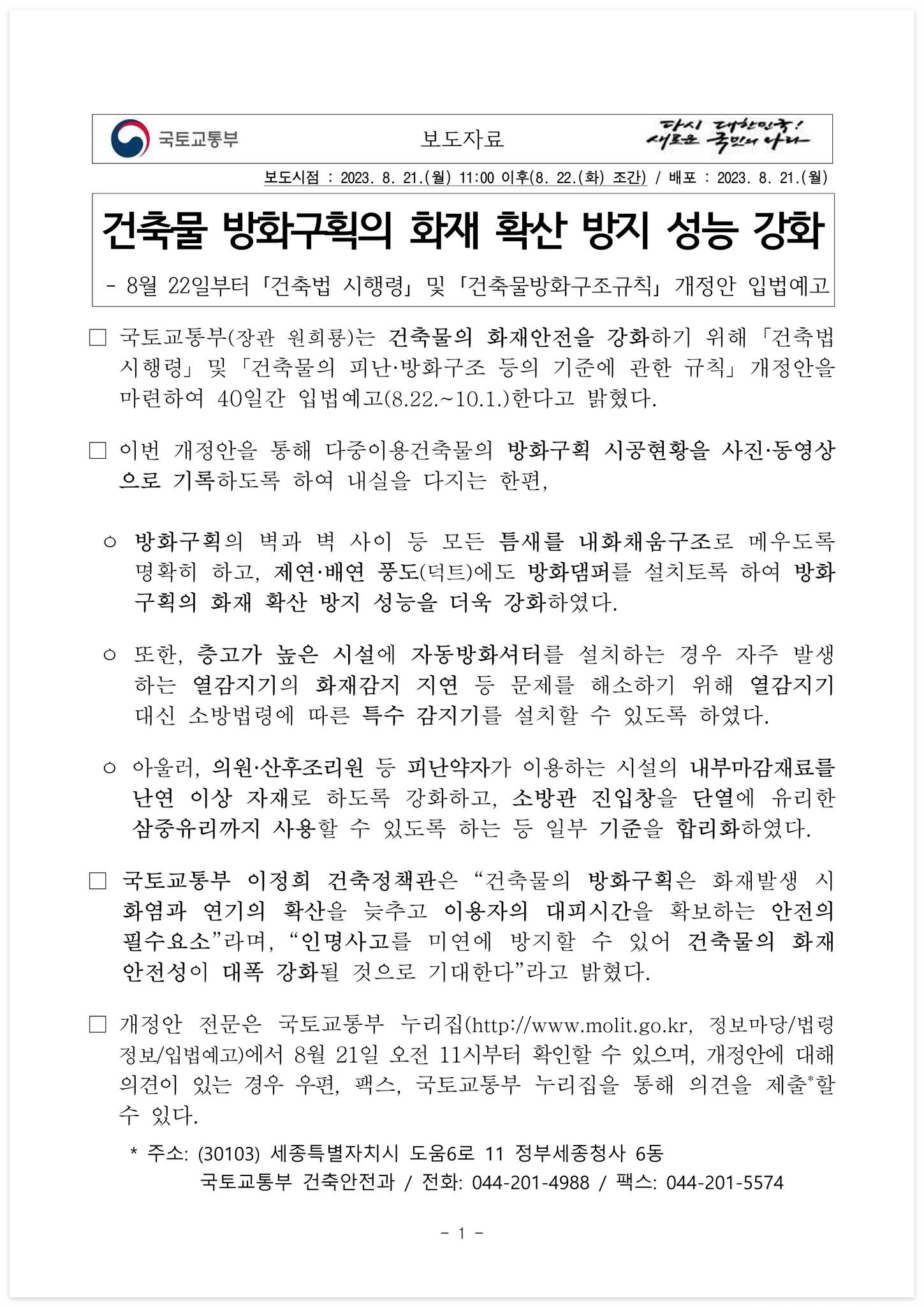 □ 자료 다운로드 : 230822(조간)_건축물_방화구획의_화재_확산_방지_성능_강화(건축안전과)