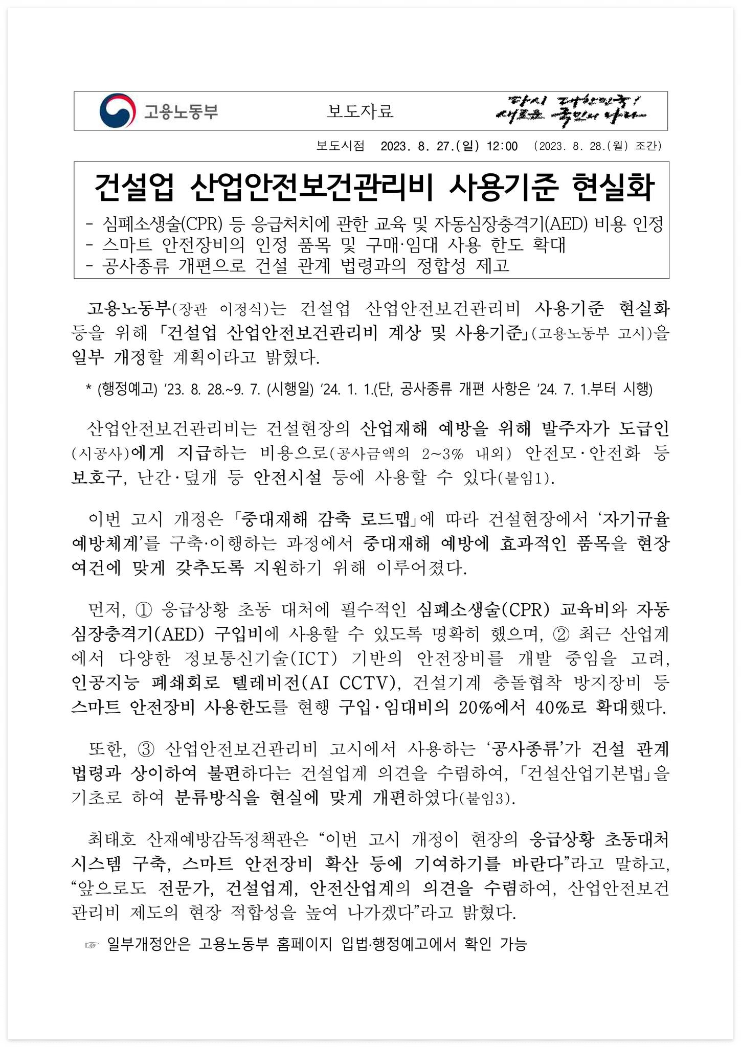 최태호 산재예방감독정책관은 “이번 고시 개정이 현장의 응급상황 초동대처 시스템 구축, 스마트 안전장비 확산 등에 기여하기를 바란다”라고 말하고, “앞으로도 전문가, 건설업계, 안전산업계의 의견을 수렴하여, 산업안전보건관리비 제도의 현장 적합성을 높여 나가겠다”라고 밝혔다.