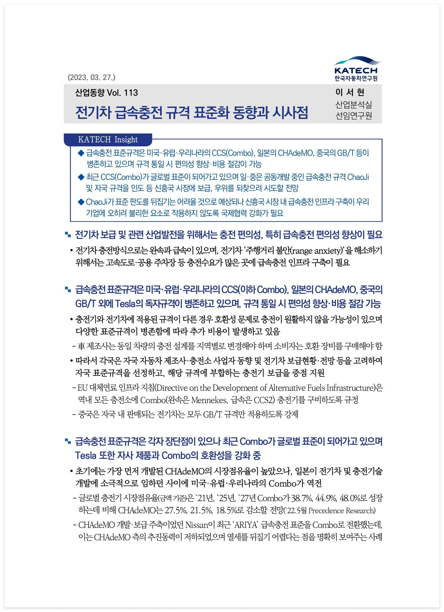 □ 제목 : 전기차 급속충전 규격 표준화 동향과 시사점