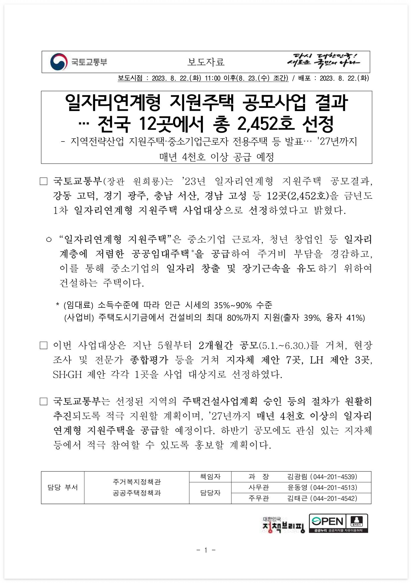 □ 자료 다운로드 : 230823(조간)_일자리연계형_지원주택_공모사업_결과_발표(공공주택정책과)