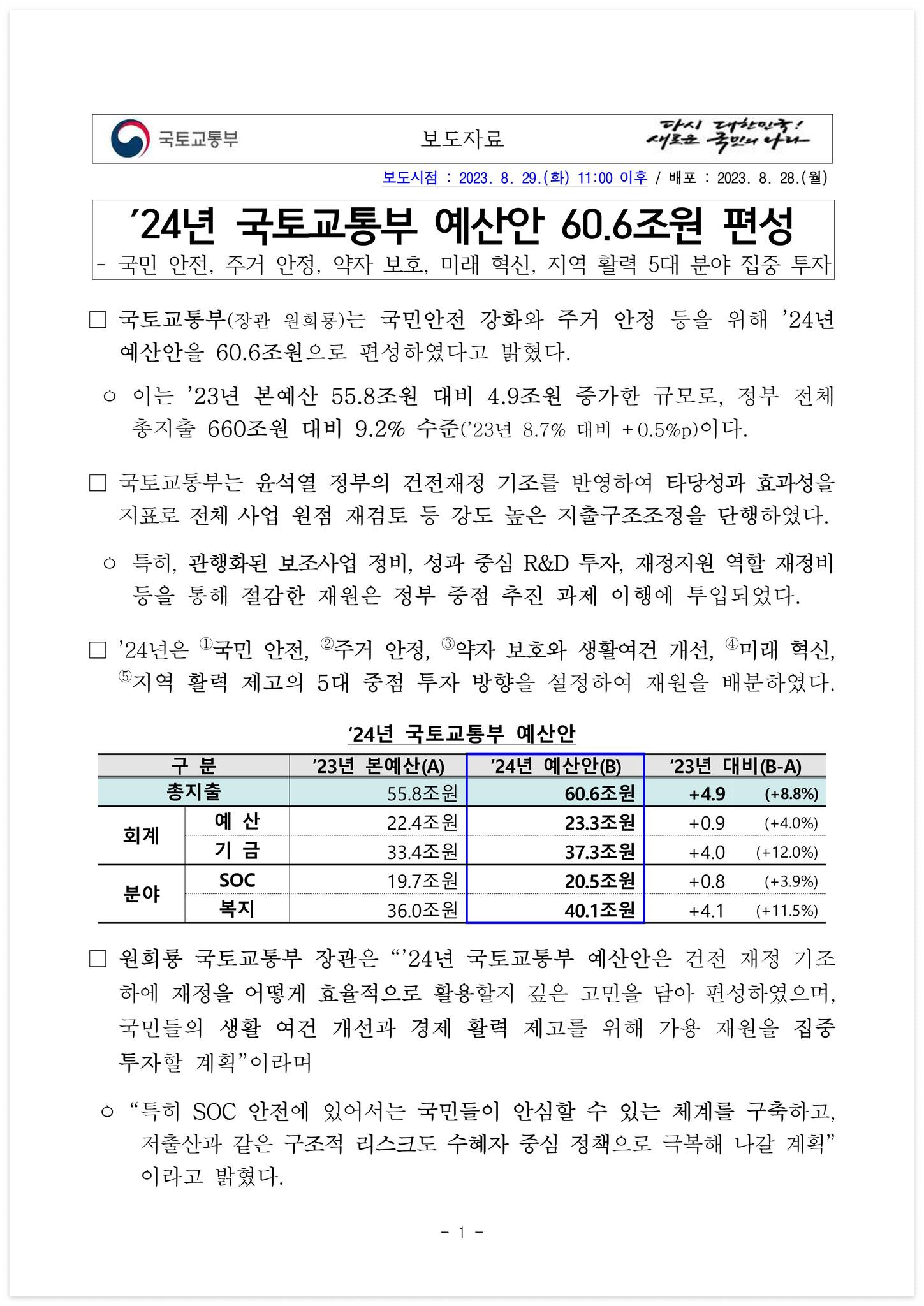 □ 자료 다운로드 : 230829(석간)24년_국토교통부_예산안_60.6조원_편성(재정담당관)