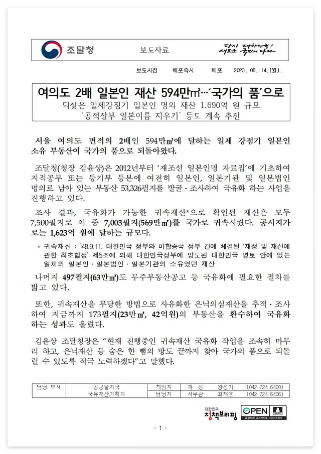 □ 자료 다운로드 : 230814_(보도자료)_일본인재산_국유화_성과_배포용
