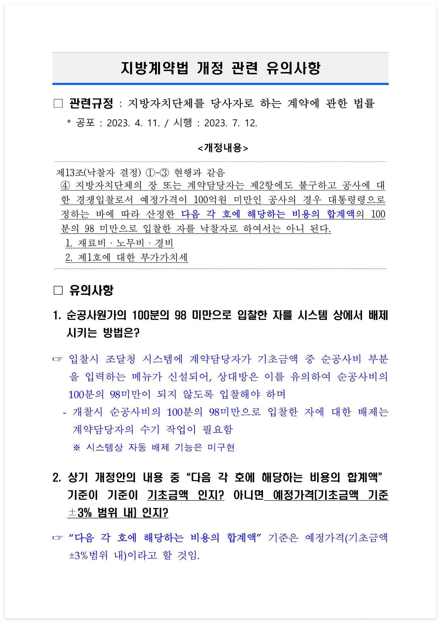 □ 자료 다운로드 : 230808-(붙임)지방계약법 개정 관련 유의사항(행안부)