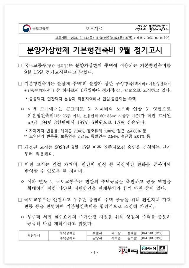 □ 자료 다운로드 : 230915(조간)_분양가상한제_기본형건축비_9월_정기고시(주택정책과)