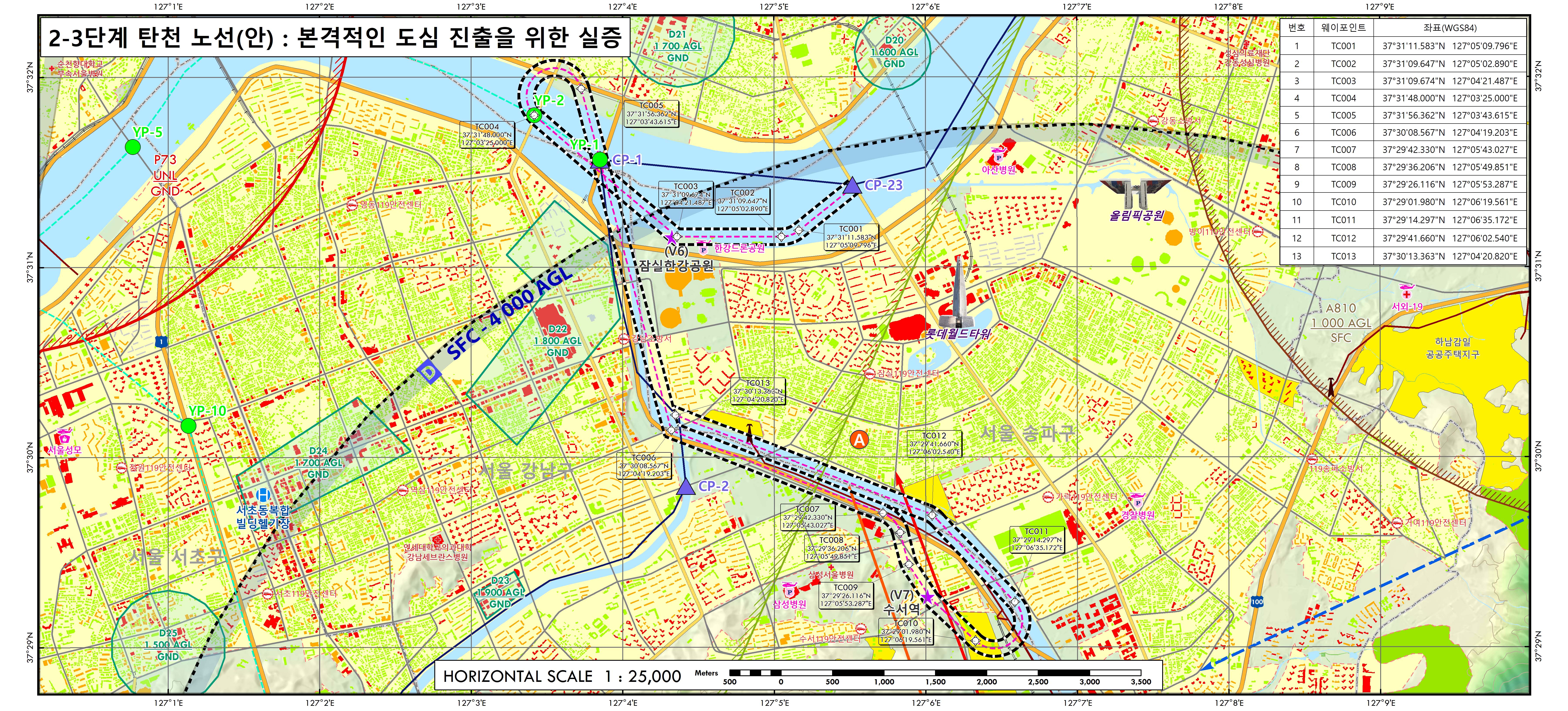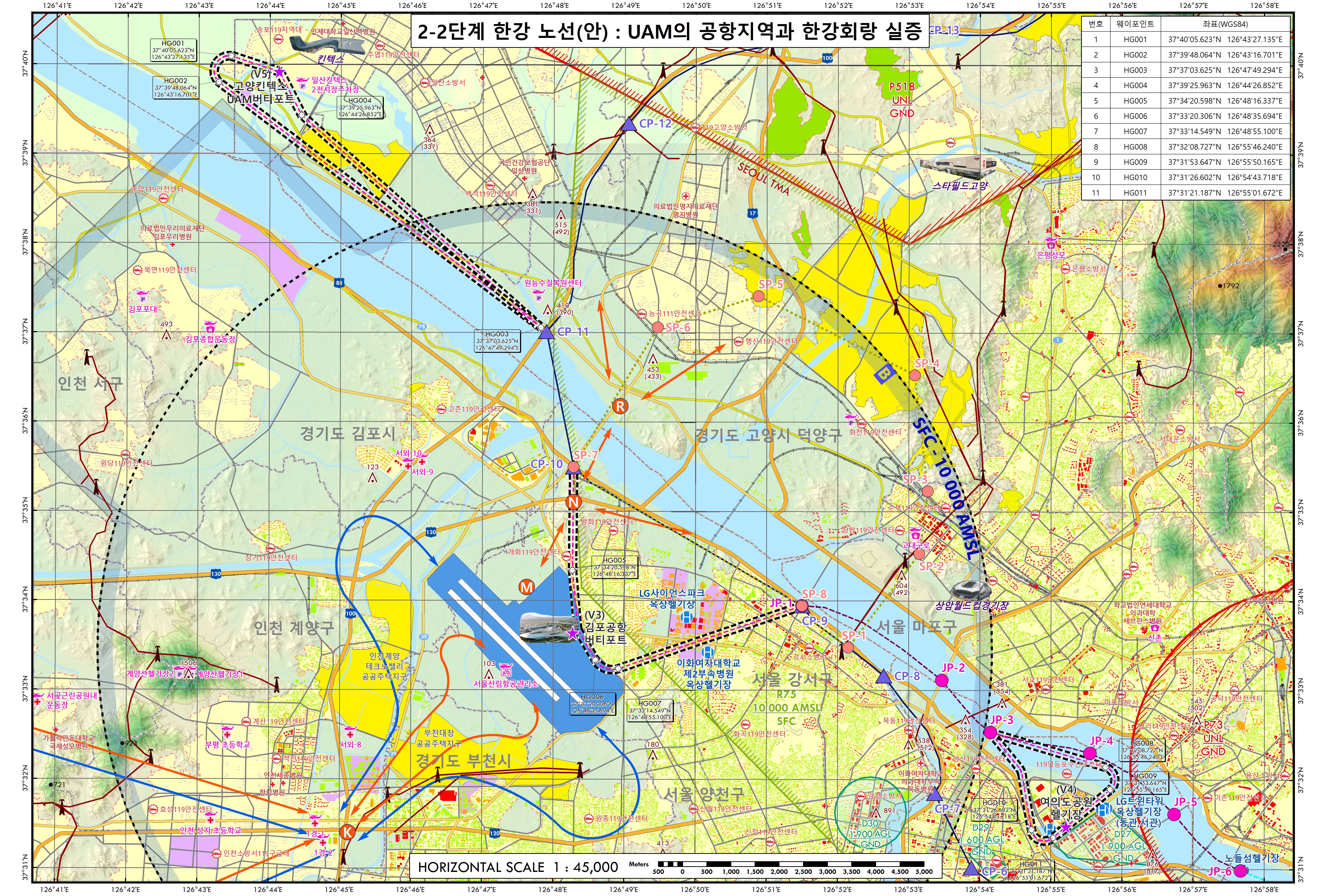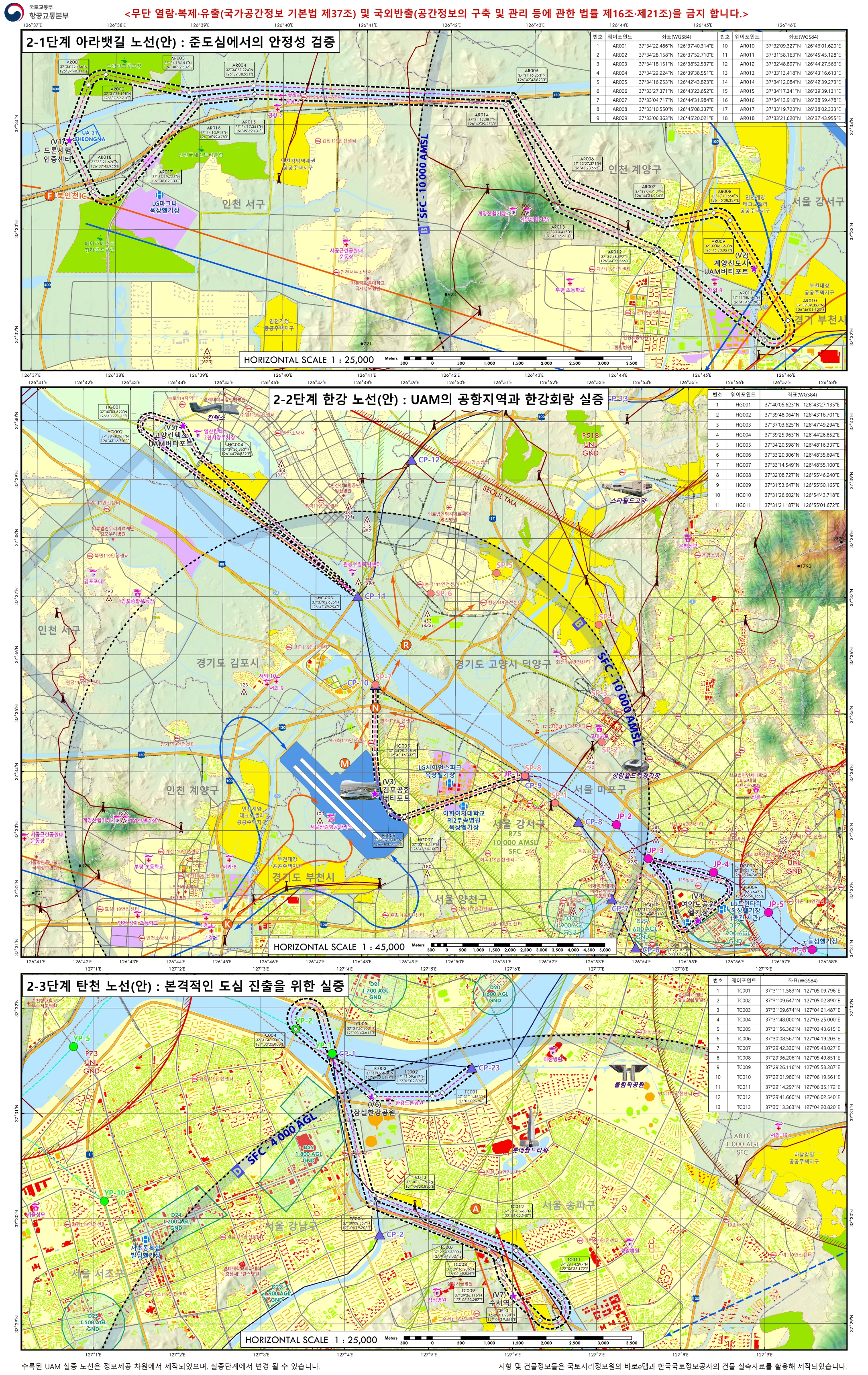 ㅇ 이 지도에는 지난 5월 발표된 ‘도심항공교통(UAM) 2단계 수도권 실증 노선(아라뱃길·한강·탄천)’을 중심으로 주요 장애물(고압선, 철탑 등), 비행제한·금지 공역, 건물 높이 정보 등이 수록되어 있어 실증사업에 본격 활용될 것으로 기대된다.