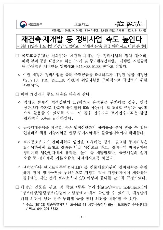- 9월 11일부터 도정법 개정안 입법예고… 역세권 뉴:홈 공급 위한 제도 마련 본격화