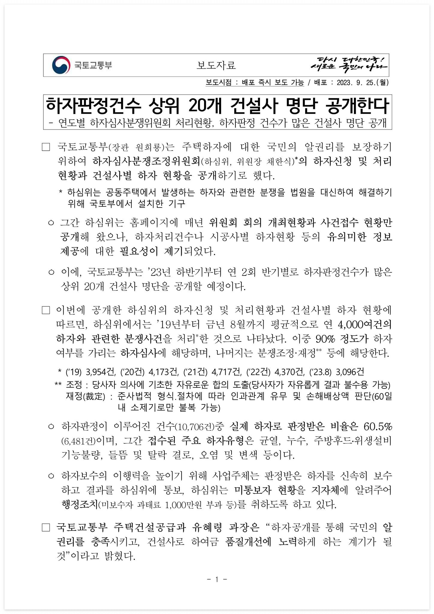 □ 자료 다운로드 : 230925(보도자료)_하자판정건수_상위_20개_건설사_명단_공개한다(주택건설공급과)