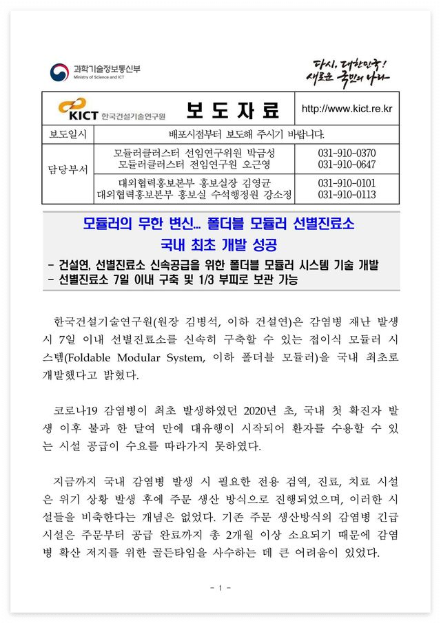 □ 자료 다운로드 : 건설연 보도자료_모듈러의 무한 변신... 폴더블 모듈러 선별진료소 국내 최초 개발 성공