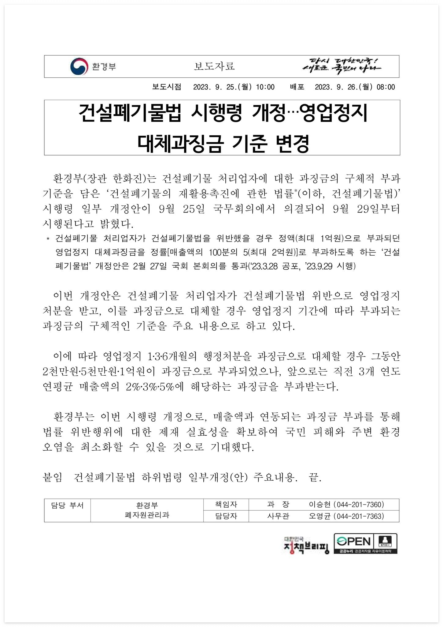 □ 자료 다운로드 : 건설폐기물법 시행령 개정 영업정지 대체과징금 기준 변경(보도자료 폐자원 9.25)