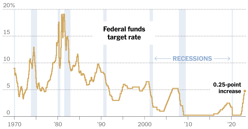 전반적으로 이 그래프는 연방 기금 목표 금리가 시간이 지남에 따라 어떻게 변했는지, 그리고 경기 침체 기간과의 관계를 시각적으로 보여줍니다.