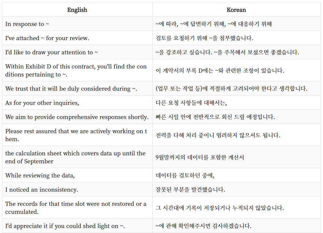| Looking forward to your response and thank you for your assistance in this matter. | 회신 기다리겠으며, 본 건에 대해 도와주셔서 감사합니다. |