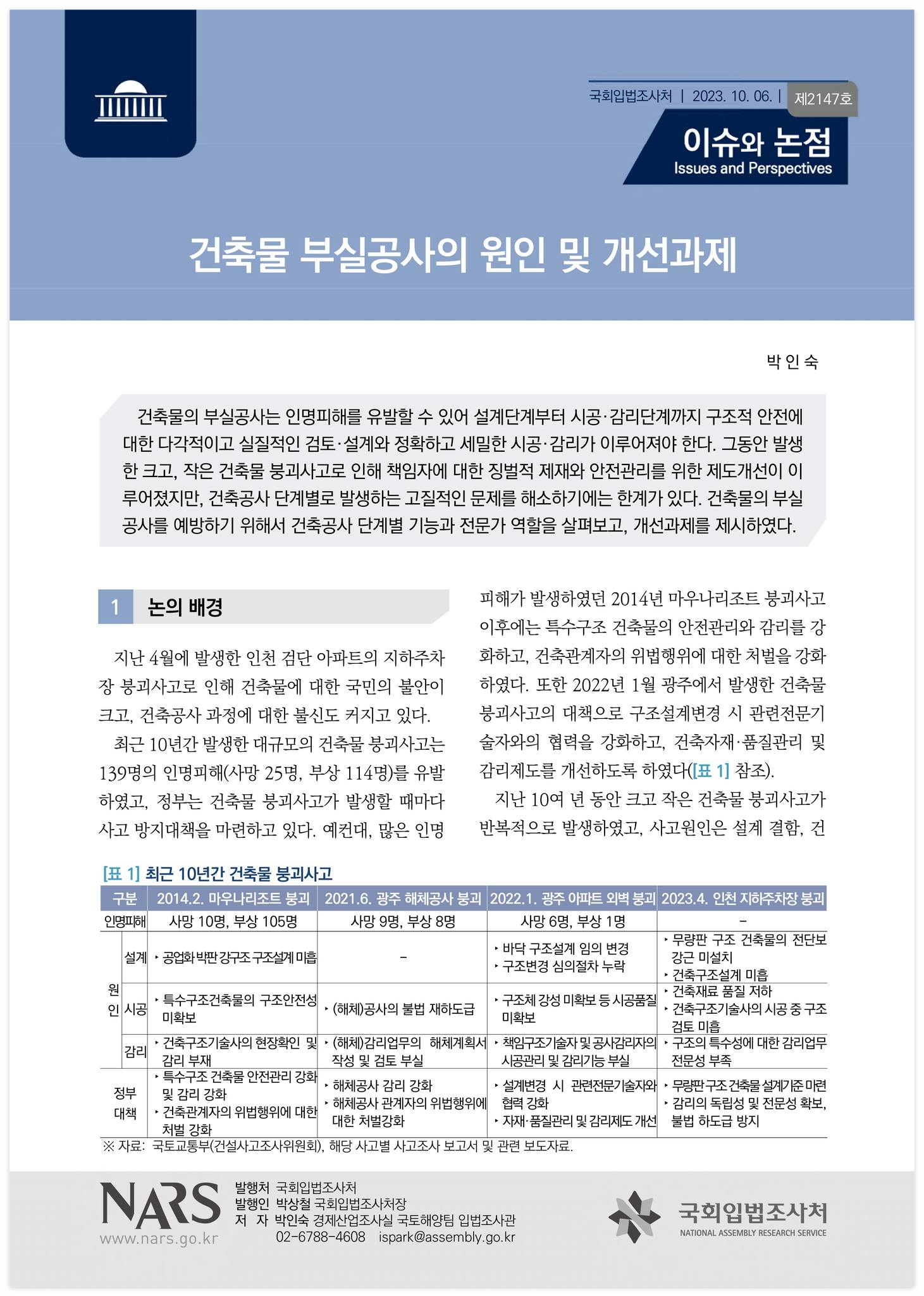□ 자료 다운로드 : (이슈와논점_2147호-20231006)건축물_부실공사의_원인_및_개선과제