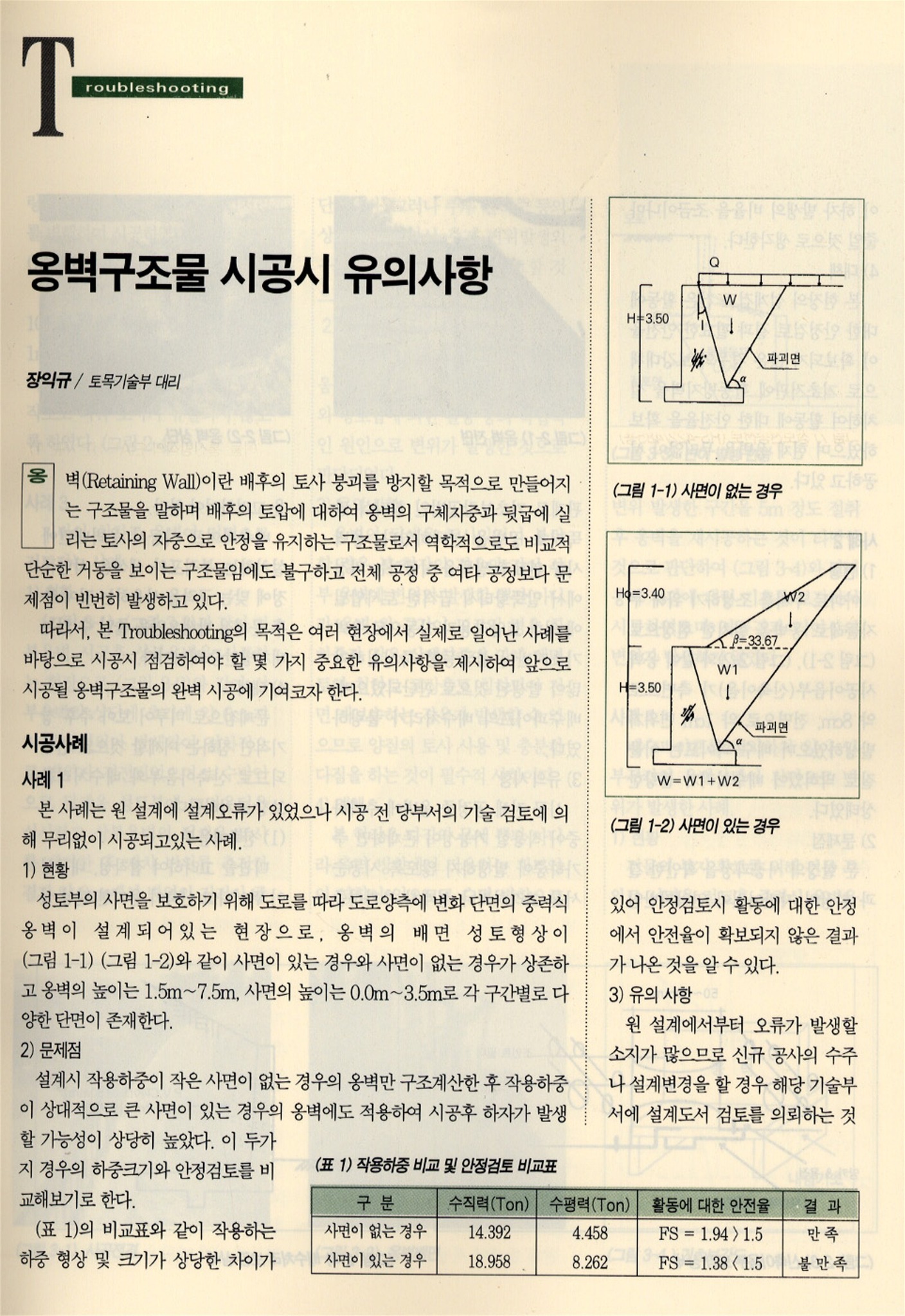 옹벽(Retaining Wall)이란 배후의 토사 붕괴를 방지할 목적으로 만들어지는 구조물을 말하며 배후의 토압에 대하여 옹벽의 구체자중과 뒷굽에 실리는 토사의 자중으로 안정을 유지하는 구조물로서 역학적으로도 비교적 단순한 거동을 보이는 구조물임에도 불구하고 전체 공정 중 여타 공정보다 문제점이 빈번히 발생하고 있다. 따라서, 본 Troubleshooting의 목적은 여러 현장에서 실제로 일어난 사례를 바탕으로 시공시 점검하여야 할 몇 가지 중요한 유의사항을 제시하여 앞으로 시공될 옹벽구조물의 완벽 시공에 기여코자 한다.