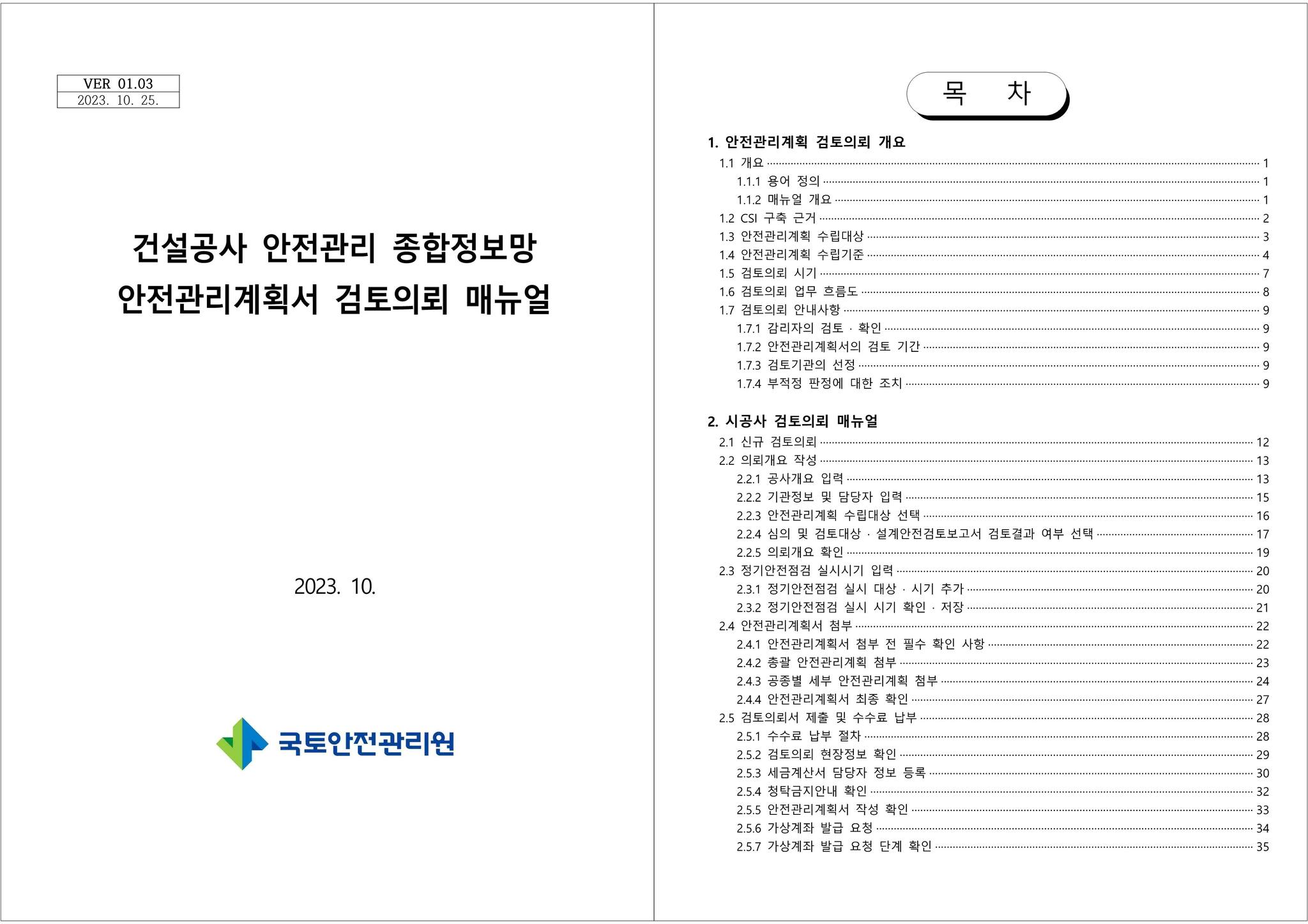 건설공사 안전관리 종합정보망 안전관리계획서 및 검토결과 제출 매뉴얼 □ 제목 : 건설공사 안전관리 종합정보망 안전관리계획서 및 검토결과 제출 매뉴얼 □ 발행 : 2023. 7. □ 형식 : hwp, pdf 60
