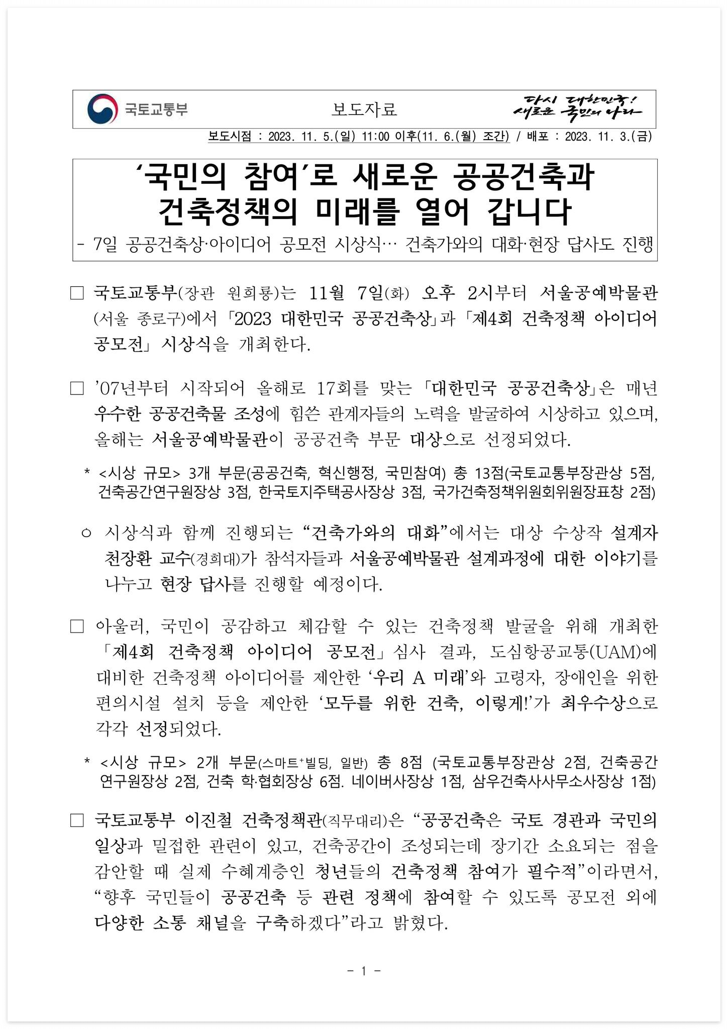□국토교통부(장관 원희룡)는 11월 7일(화) 오후 2시부터 서울공예박물관(서울 종로구)에서 「2023 대한민국 공공건축상」과 「제4회 건축정책 아이디어 공모전」 시상식을 개최한다.