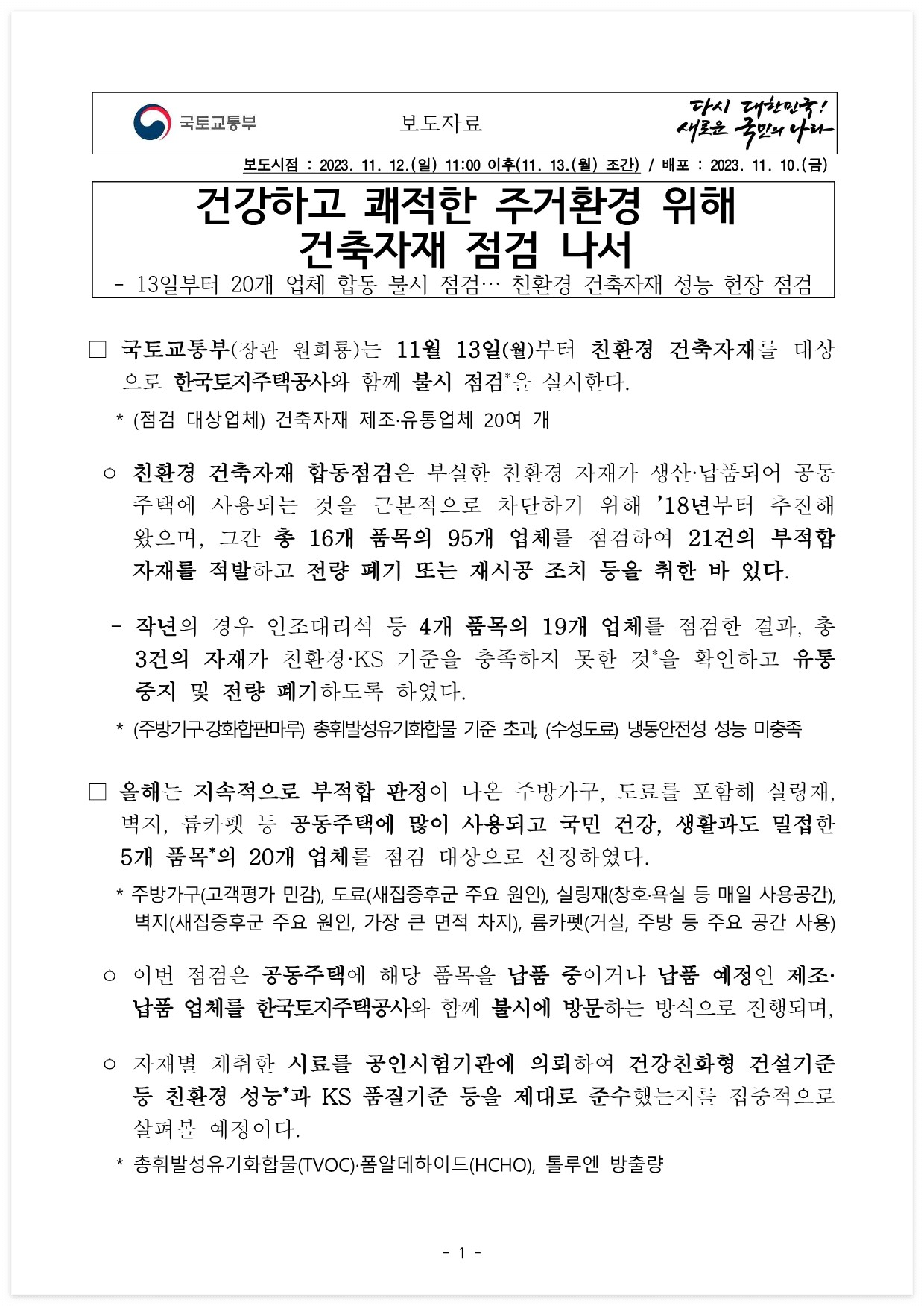 □ 국토교통부(장관 원희룡)는 11월 13일(월)부터 친환경 건축자재를 대상으로 한국토지주택공사와 함께 불시 점검*을 실시한다.