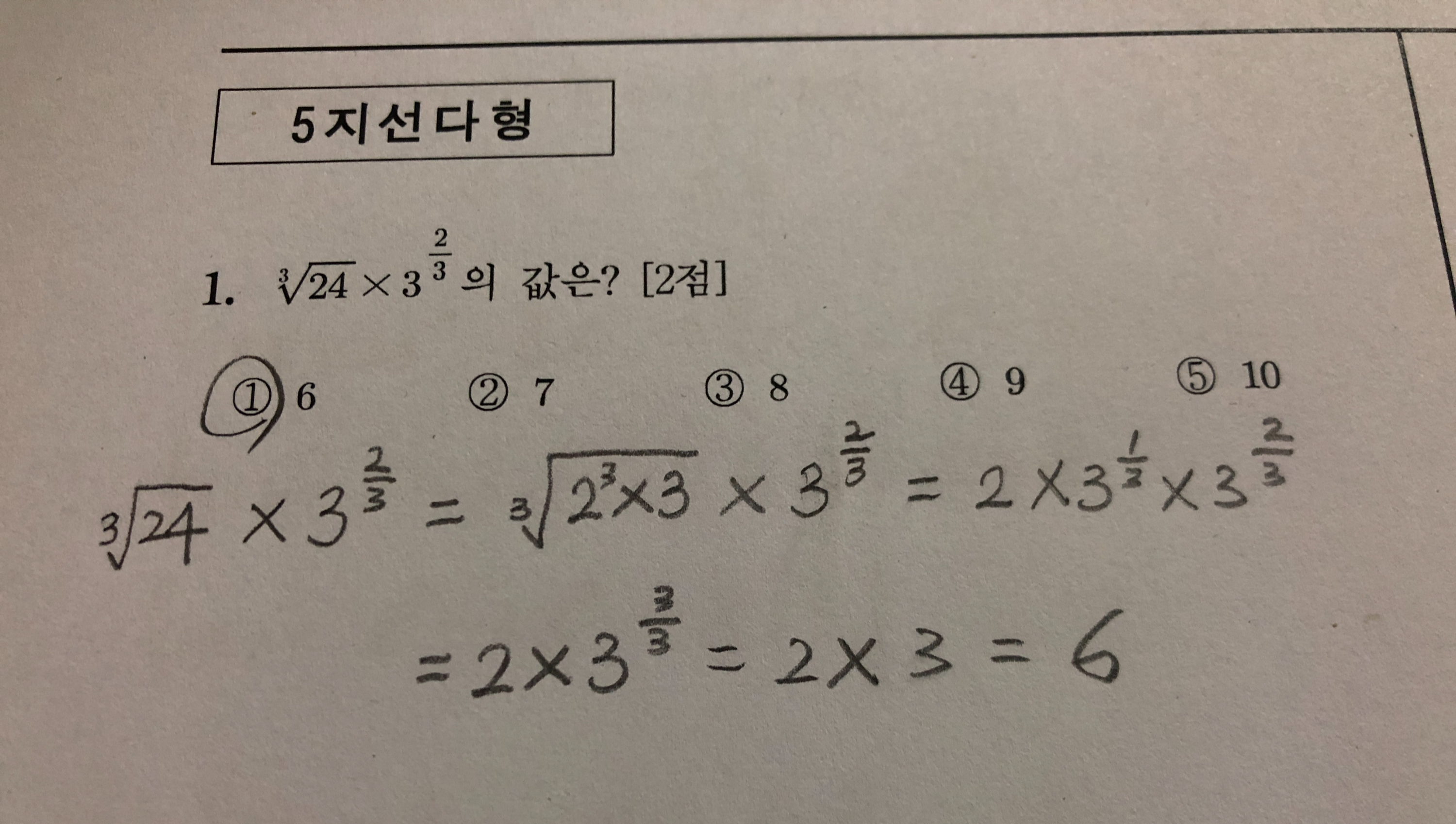 3제곱근을 풀어내는 것은 어렵지 않은데 지수의 1/3과 2/3을 어떻게 처리하는지 아느냐고 묻는 문제입니다. 곱셈에서는 지수를 더해야 하므로 당연히 1이 되고 결국 단순 구구단 문제로 풀리게 됩니다.