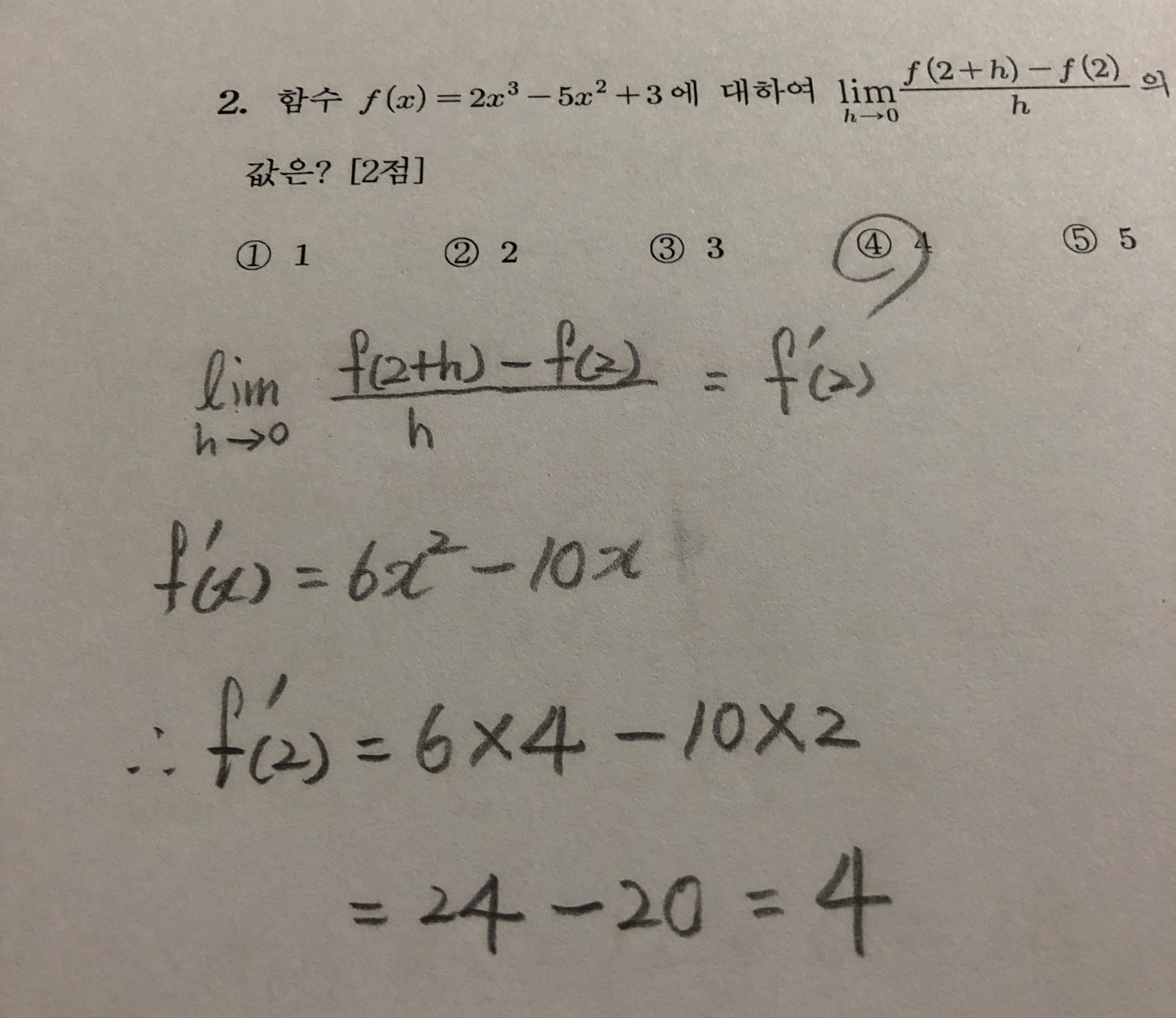 2번 문제는 극한 문제입니다. 극한의 원리를 아는지를 묻는 문제입니다. 극한 문제가 곧바로 f'(2)라는 것을 떠올릴 수 있는지 여부가 관건입니다. 이게 안되면 절대로 풀지 못합니다. 수능 시험 중에 증명을 할 수도 없는 노릇이지만, 증명하는 것도 쉽지 않기 때문입니다.