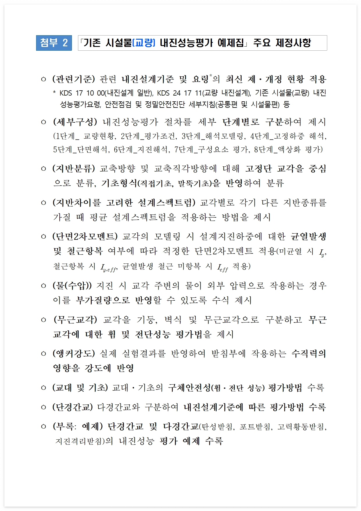 위탁용역을 통해 마련된 「기존 시설물(교량) 내진성능평가 예제집(안)」에 대해 관계기관 의견조회 및 전문가 자문회의 등을 거쳐 제정을 완료하여 예제집의 제정 전문 등 관련 자료를 첨부