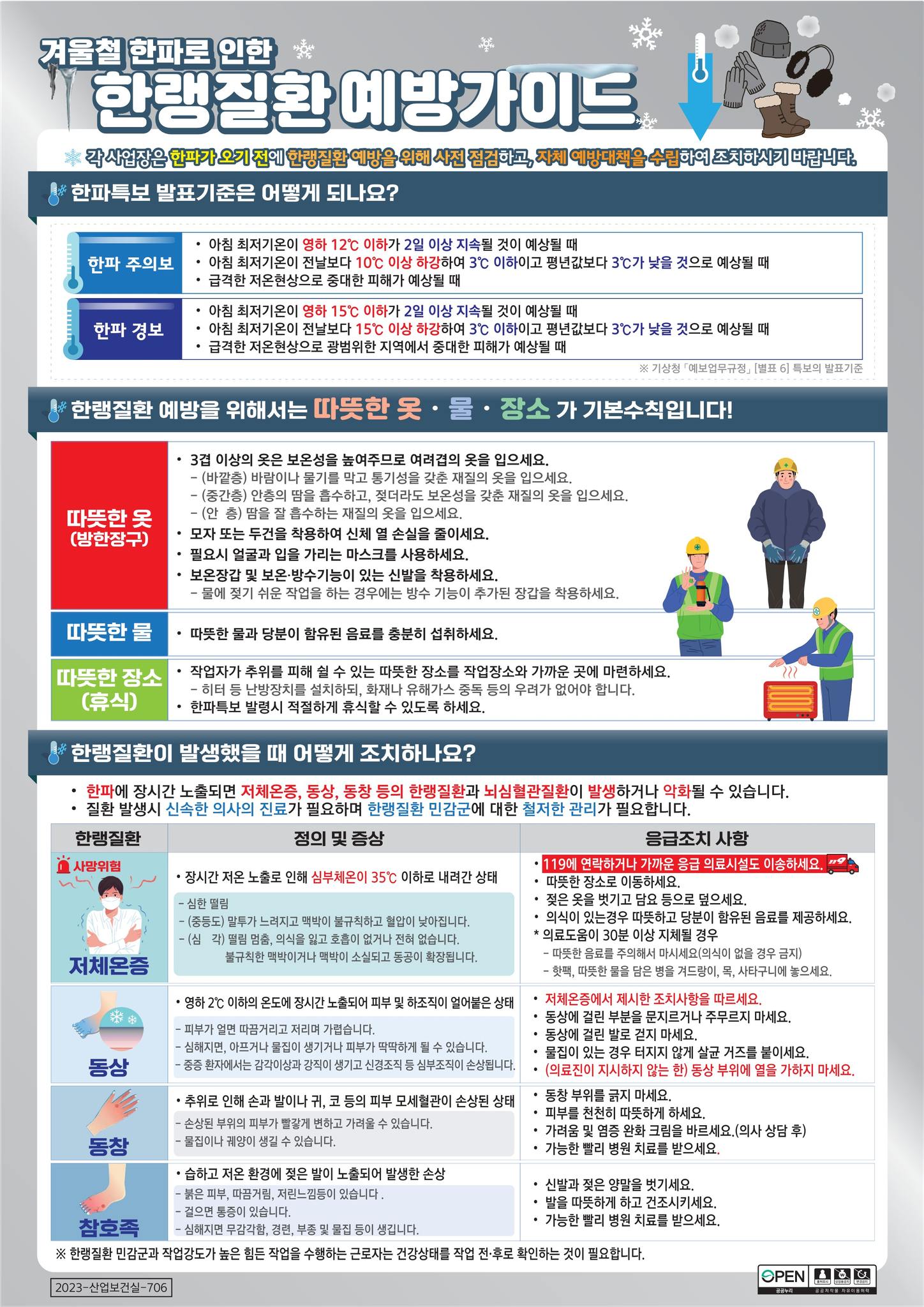 겨울철 한파 대비 한랭질환 예방가이드, 퀵가이드 및 자율점검표 등록 : 2022. 11. 17. 형식 : pdf 2 page 제작 : 안전보건공단 자료 다운로드1 : 1.한랭질환 예방가이드_웹용 자료 다운로드2 : 한랭질환