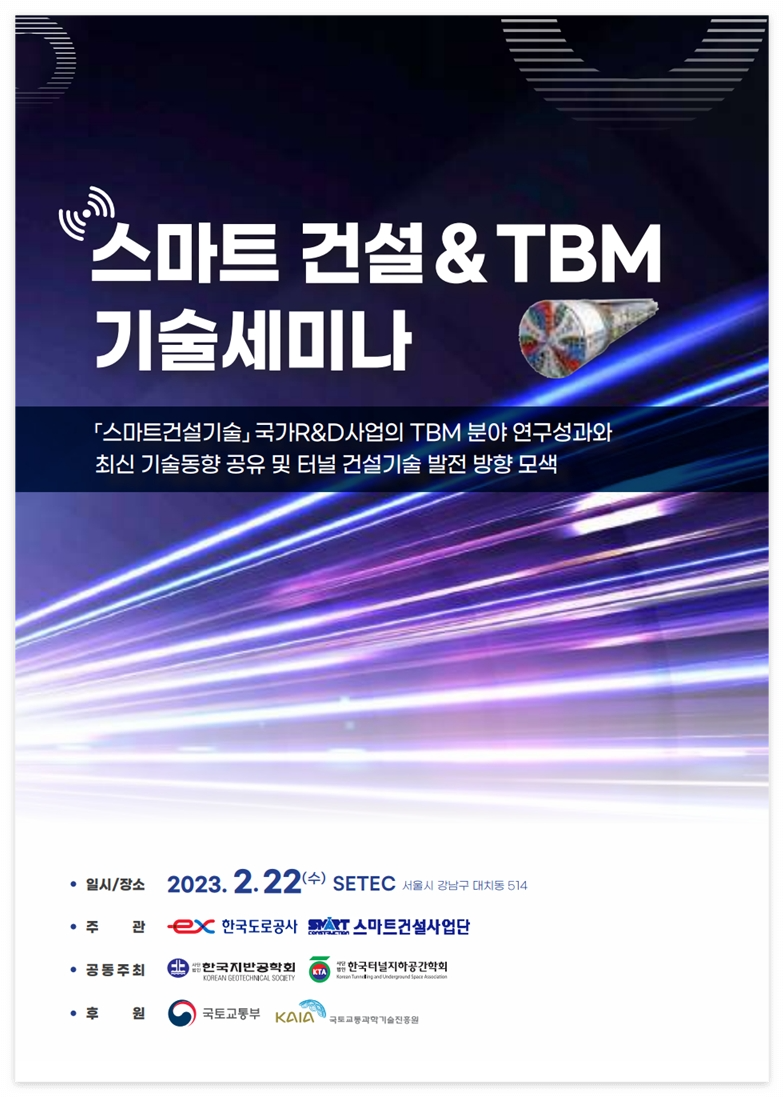 목적 : 스마트건설기술 국가R&D 사업의 TBM 분야 연구성과와 최신 기술동향 공유 및 터널 건설기술 발전 방향 모색