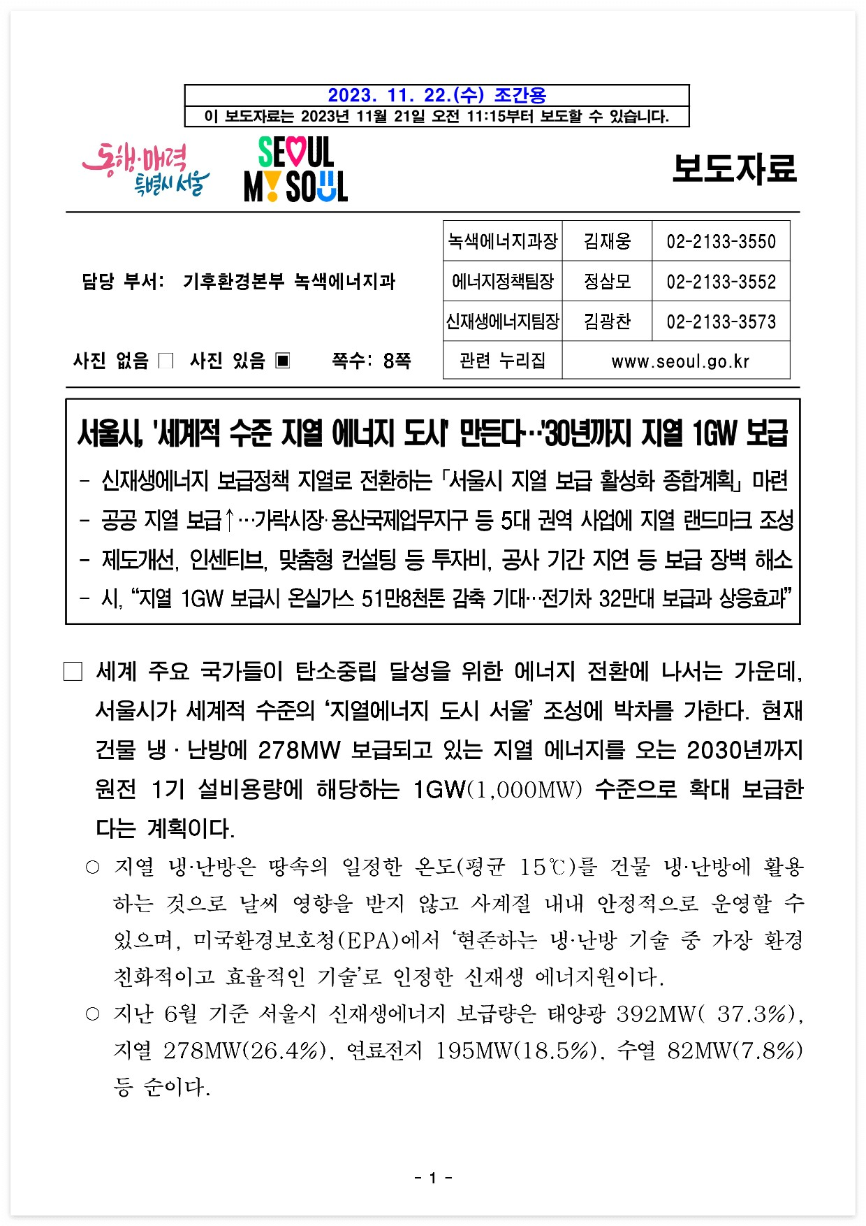 □ 자료 다운로드 : 서울시, 세계적 수준 지열 에너지 도시 만든다…30년까지 지열 1GW 보급