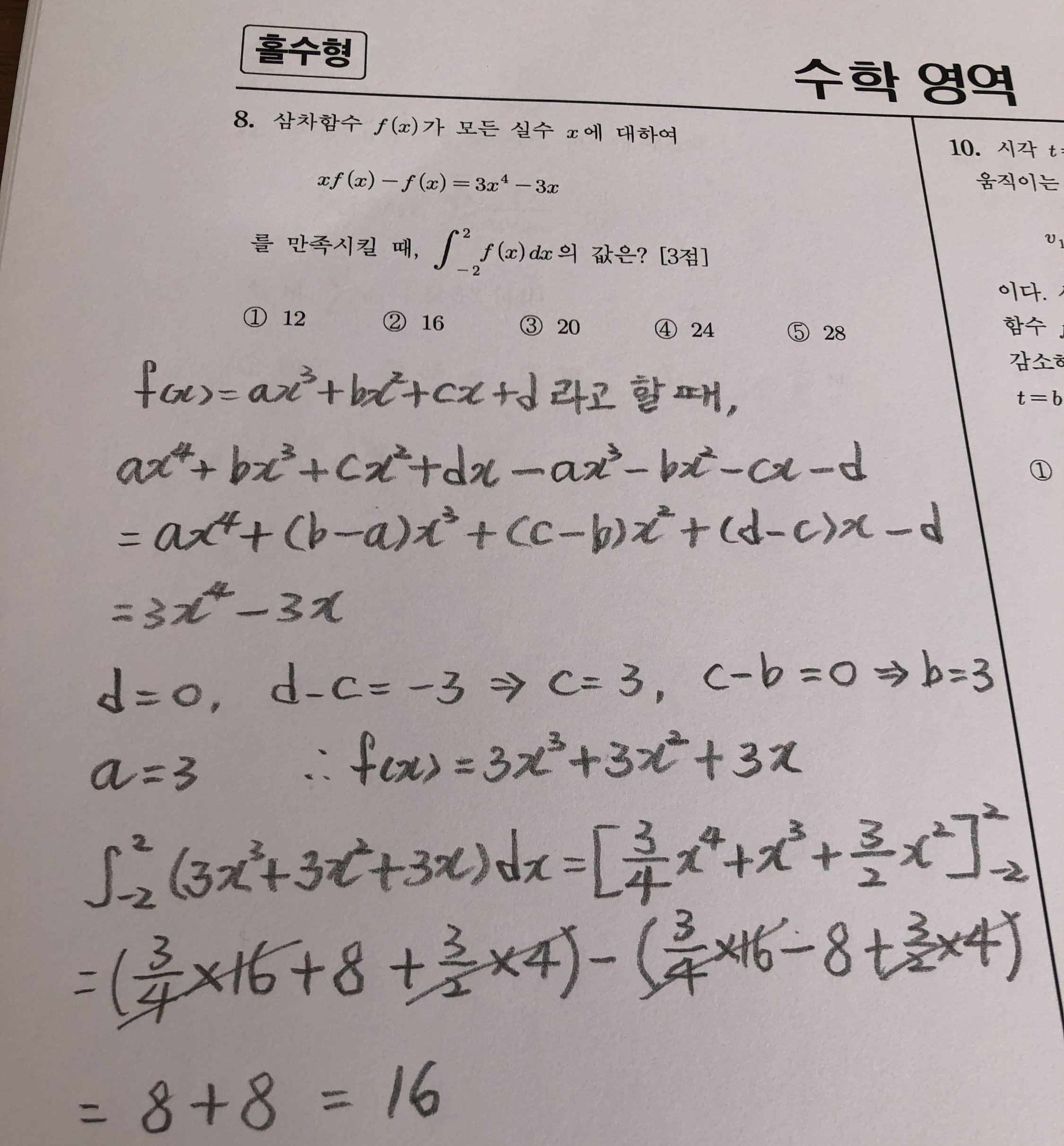 그리고 적분의 가장 기본적인 풀이 과정을 거치면 정답이 16으로 구해집니다.
