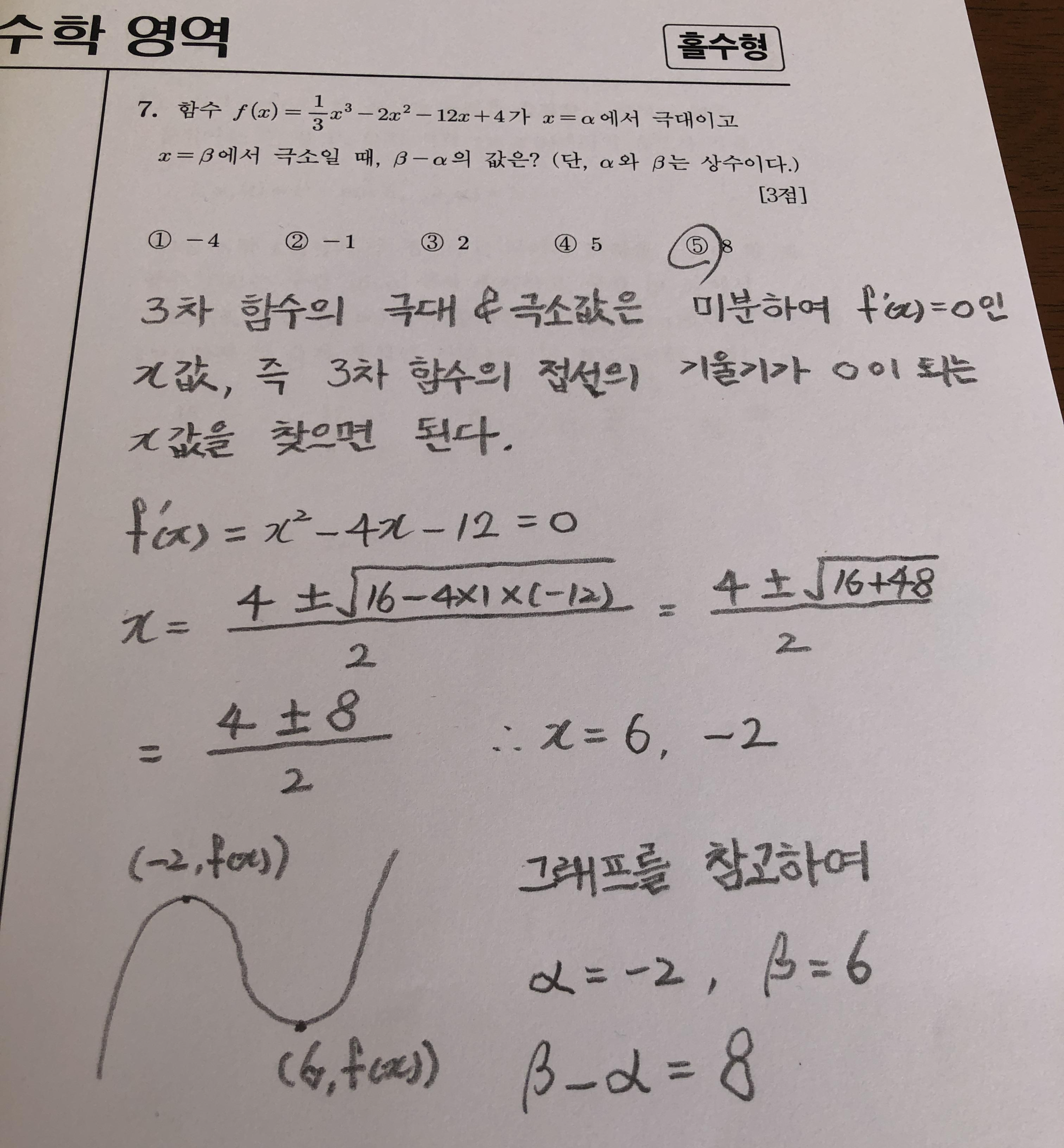 함수의 극대와 극소는 미분으로 간단히 구할 수 있습니다. 3차 함수의 미분은 접선의 기울기가 0이 되는 x값을 구할 수 있기 때문입니다. 따라서 미분을 할 줄 아는지, 그리고 극대와 극소의 의미가 미분과 어떤 관계가 있는지 아느냐고 묻는 문제입니다.