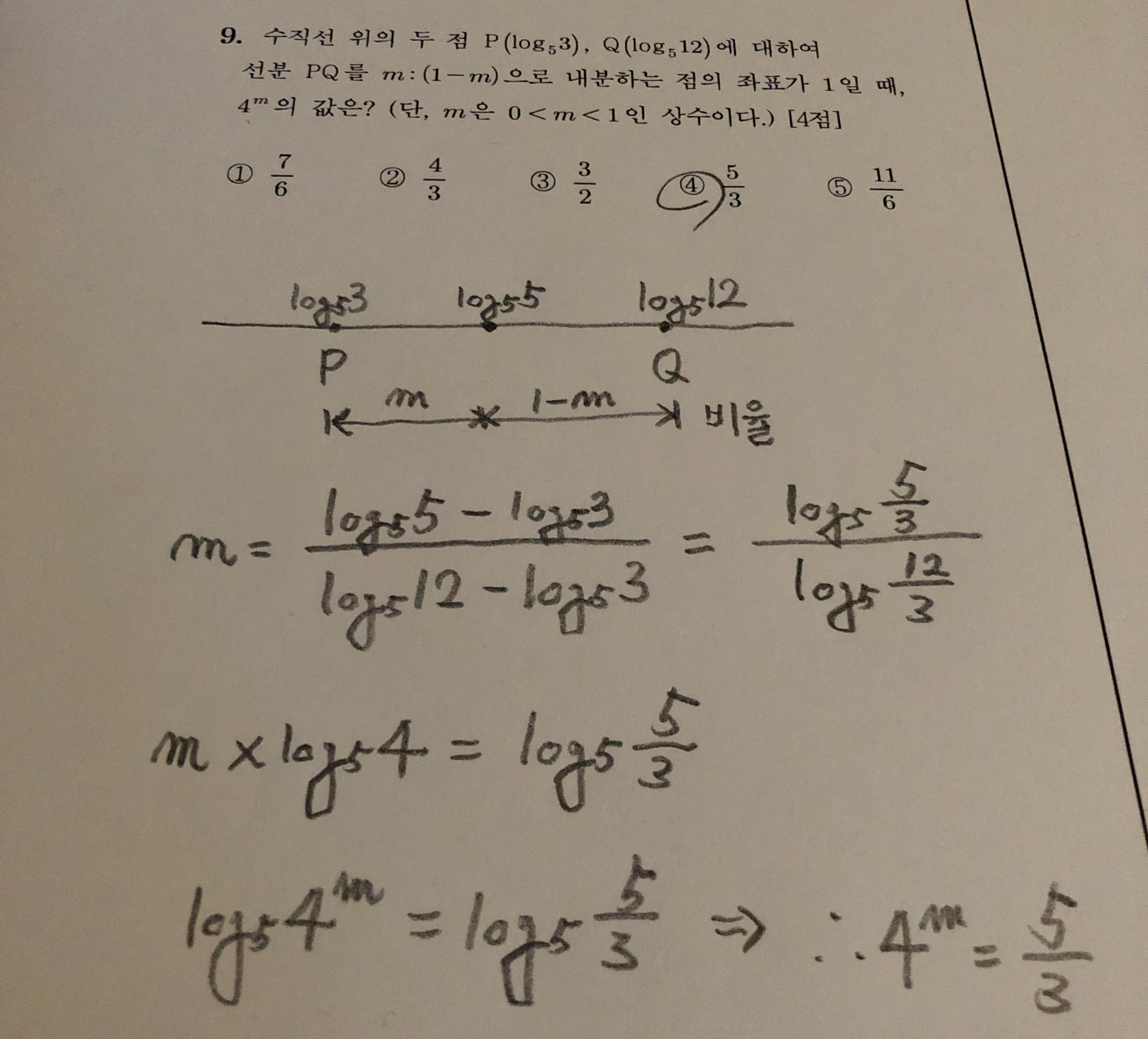 그렇게 정리하면 로그끼리의 뺄셈이 되고, 결국 로그의 뺄셈과 성질을 이해하고 있는지 묻고 있는 문제입니다. 기본적이고 간단한 로그 문제 풀이이므로 그리 어렵지는 않지만 처음에 점 P와 Q, 그리고 내분하는 점의 관계에 대해 이해하는 것이 직관적으로는 쉽지 않았던 것 같습니다.