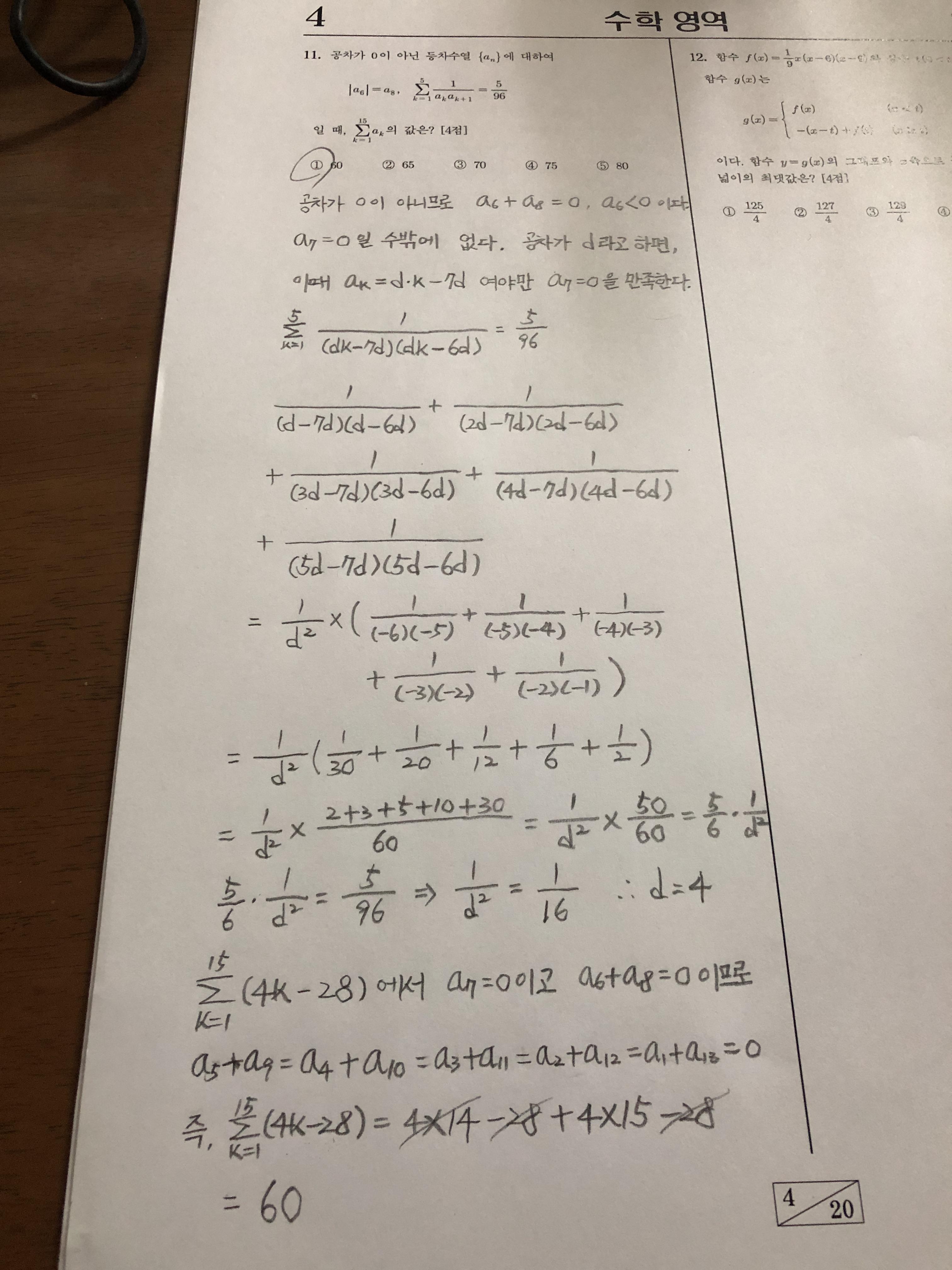 11번은 등차수열 문제입니다. 문제는 짧은데 답을 찾기 위해서는 위와 같이 고생을 좀 해야 됩니다.
