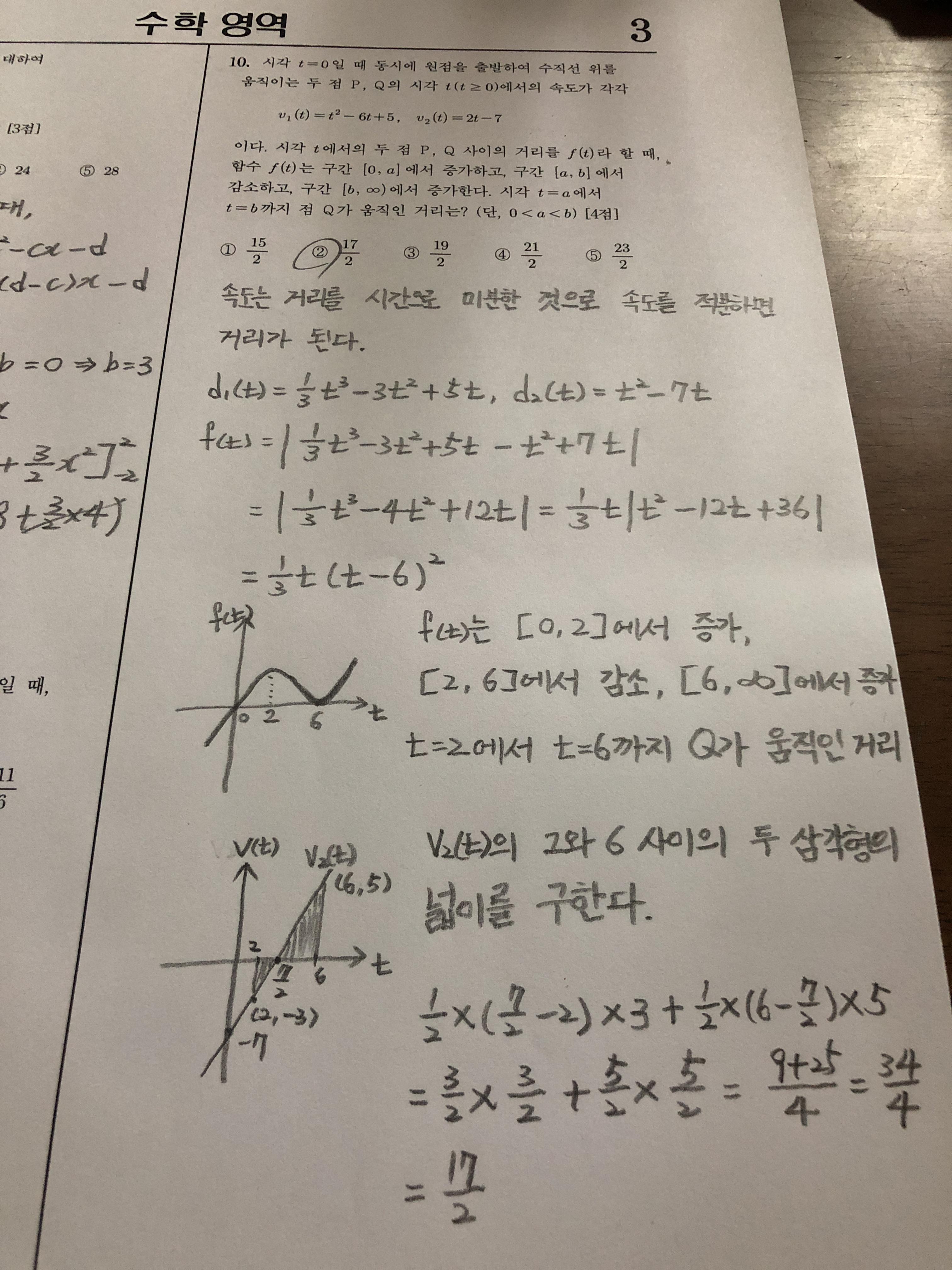 10번 문제는 속도, 거리, 시간의 관계를 이용한 전형적인 미분과 적분 문제입니다. 속도는 거리를 시간으로 미분한 것으로, 속도를 적분하면 다시 거리가 나옵니다. 이러한 속도의 개념과 미적분과의 관계를 아는지 묻는 문제입니다.