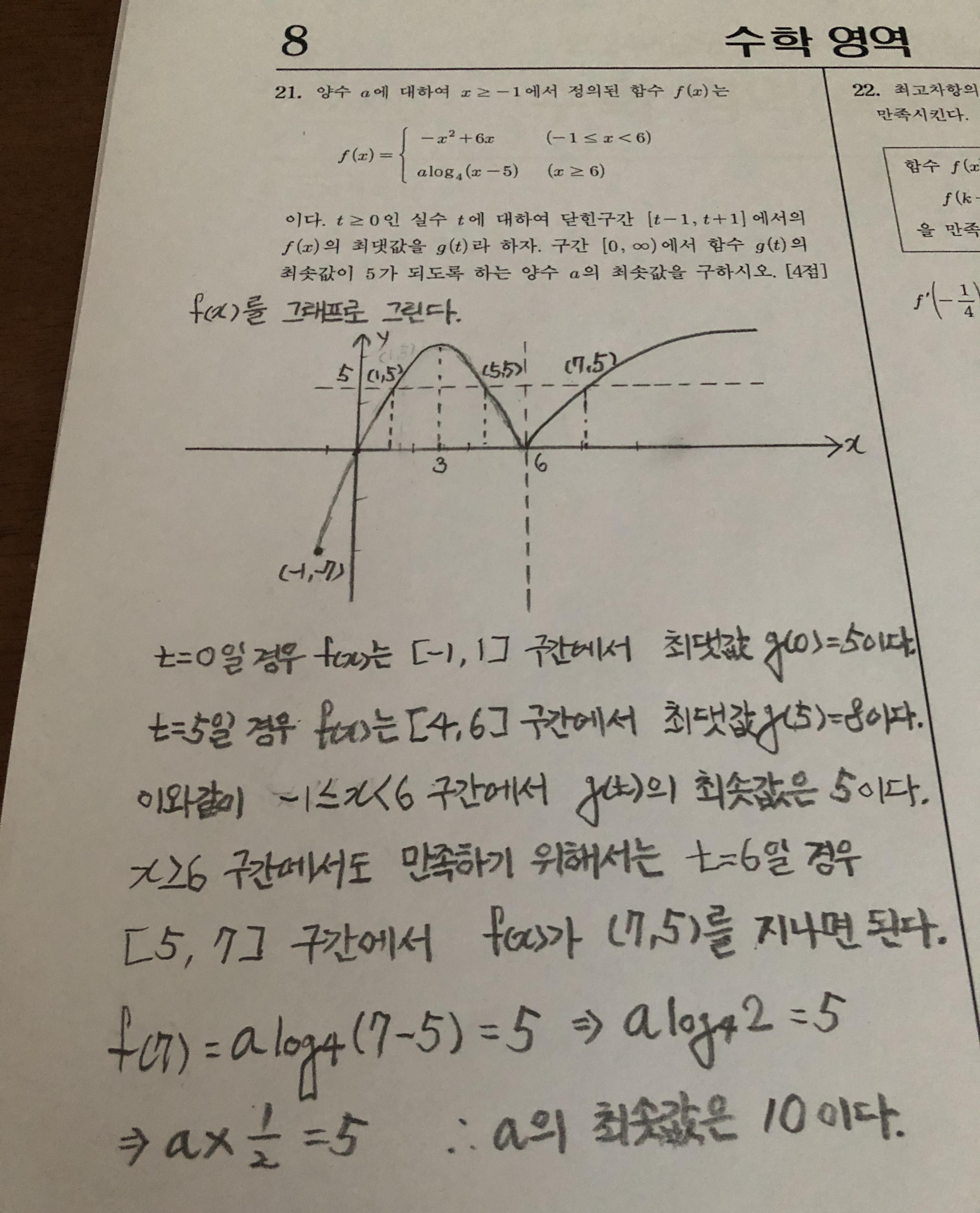 이 문제는 특정 구간에서의 최댓값을 g(t)라고 정의해 놓고 갑자기 최솟값이 5가 되어야 한다고 하니 마치 말장난 하는 것 같아서 짜증이 좀 났습니다.
