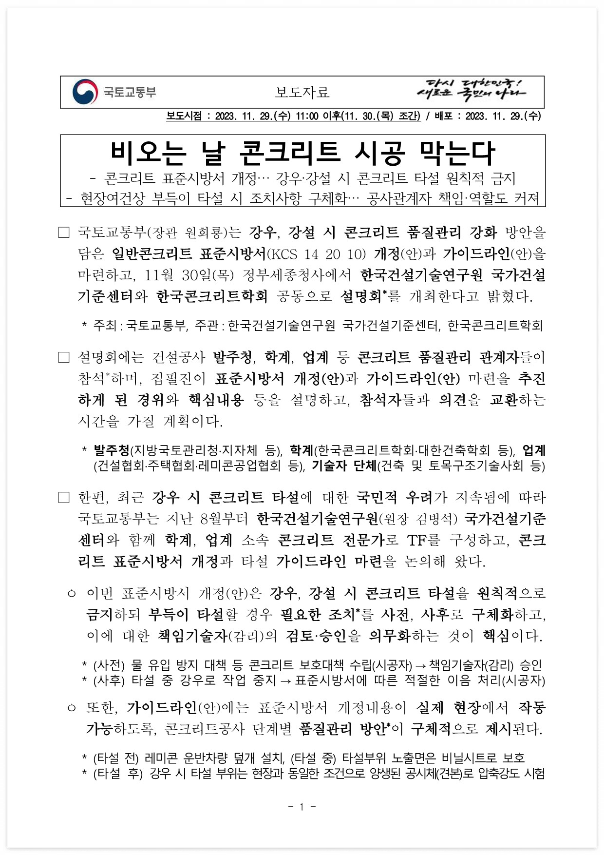 □국토교통부(장관 원희룡)는 강우, 강설 시 콘크리트 품질관리 강화 방안을 담은 일반콘크리트 표준시방서(KCS 14 20 10) 개정(안)과 가이드라인(안)을 마련하고, 11월 30일(목) 정부세종청사에서 한국건설기술연구원 국가건설기준센터와 한국콘크리트학회 공동으로 설명회*를 개최한다고 밝혔다.