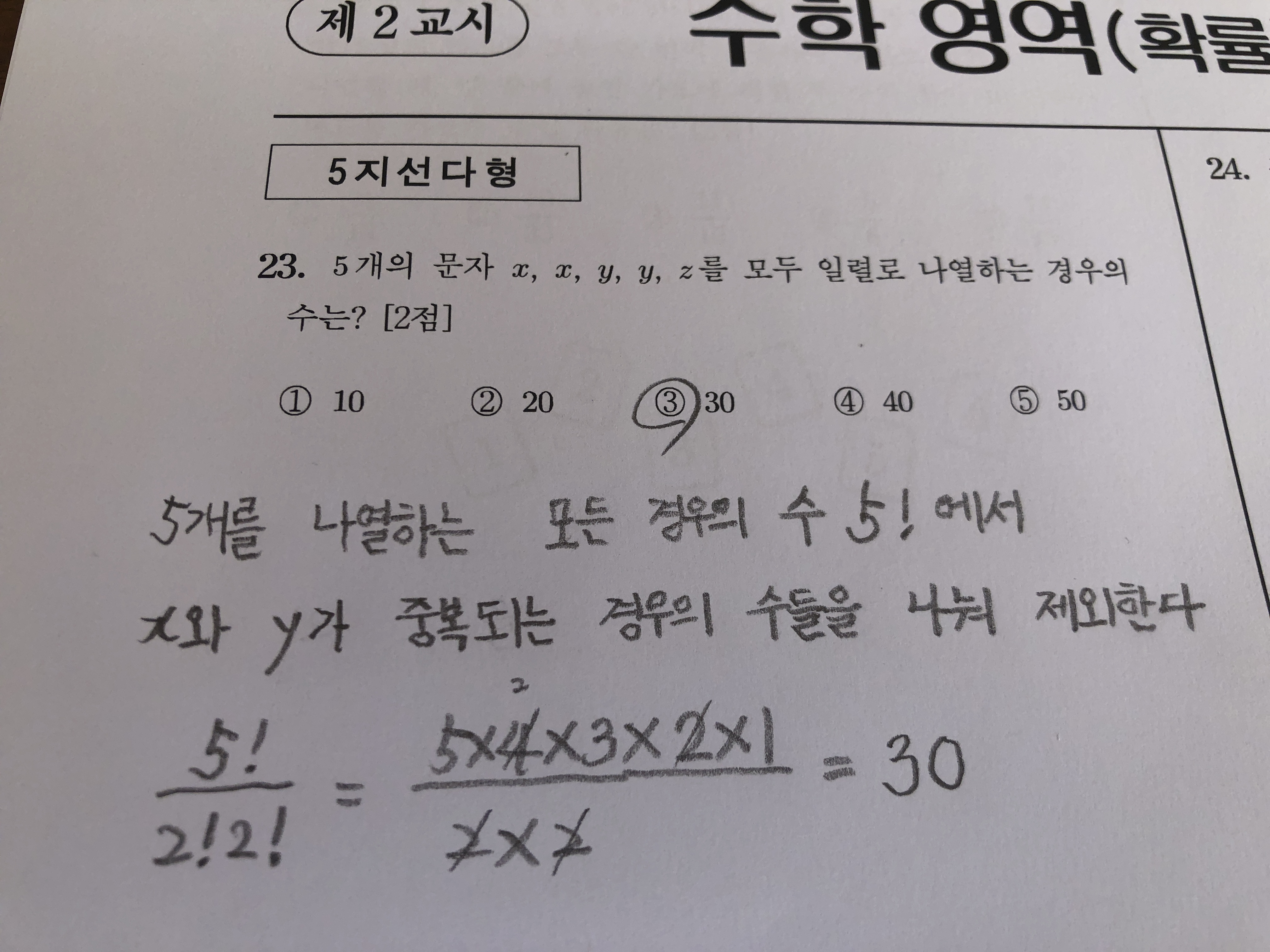 확률과 통계 문제는 일단 카드, 구슬 등 경우의 수 문제부터 다양하게 많이 풀어두면 절반 이상은 맞힐 수 있습니다. 23번 문제는 카드와 구슬을 문자로만 바꿨을 뿐 유사한 문제 유형들이 많은 대표적인 문제입니다.
