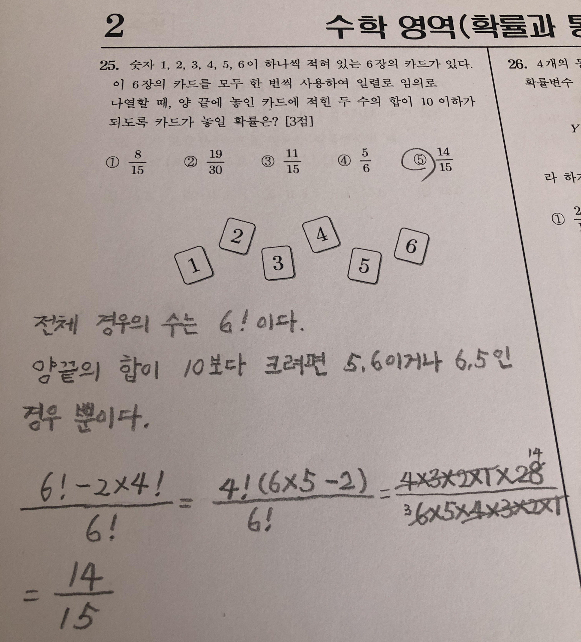 25번 문제는 제가 누누이 얘기했던 카드 문제입니다. 확률 문제는 역시 카드와 구슬이 빠지면 섭섭할 정도입니다.