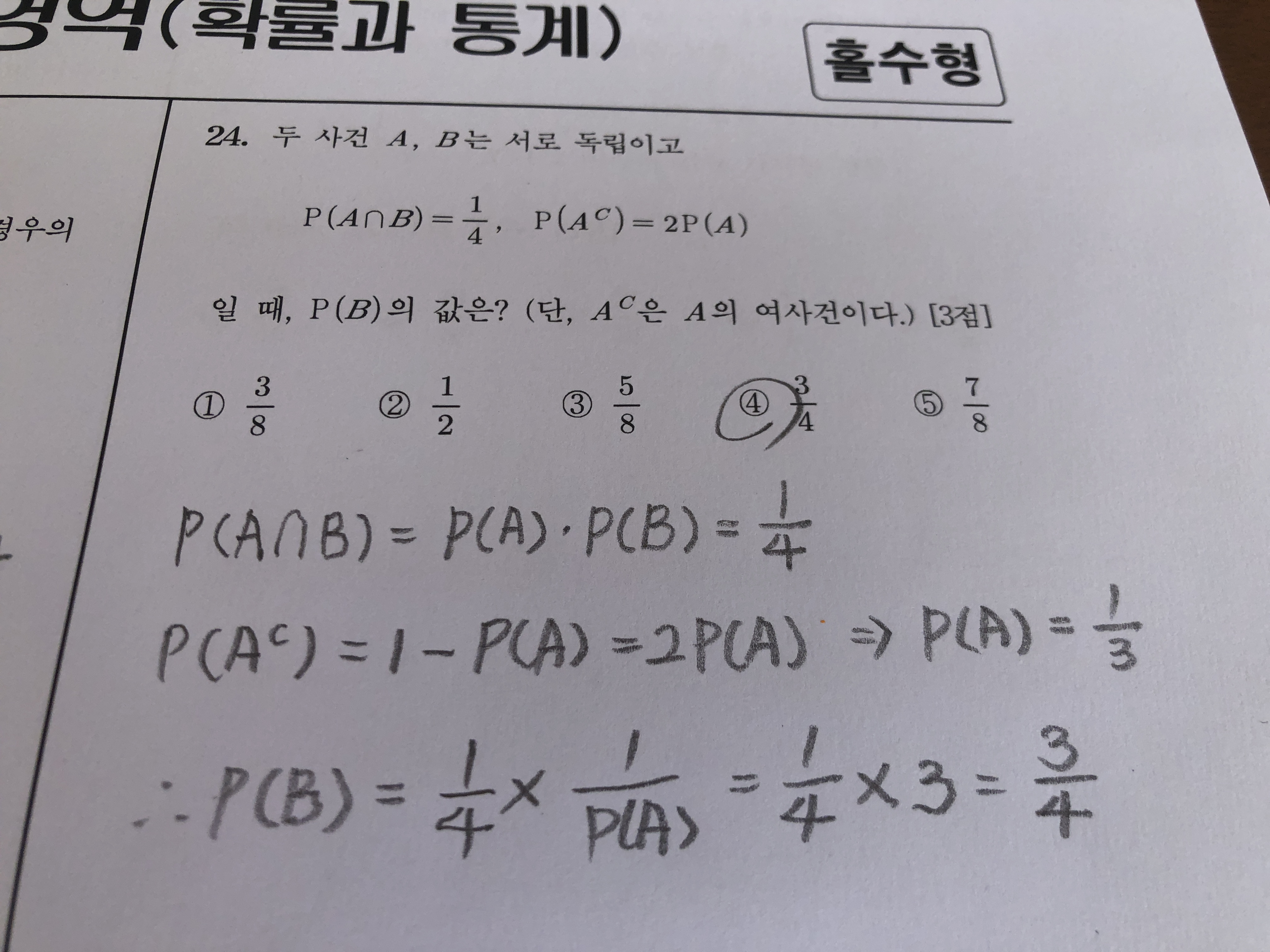 지난 시간까지는 홀수형 공통 문제 1번부터 22번까지 풀었고, 오늘은 확률과 통계로 넘어가겠습니다. 문제들은 이미 다 풀었고 - 아니 보다 정확히는 해설 들으며 공부한 문제가 절반 이상 되고요 - 순서대로, 시간나는 대로 업로드하겠습니다.