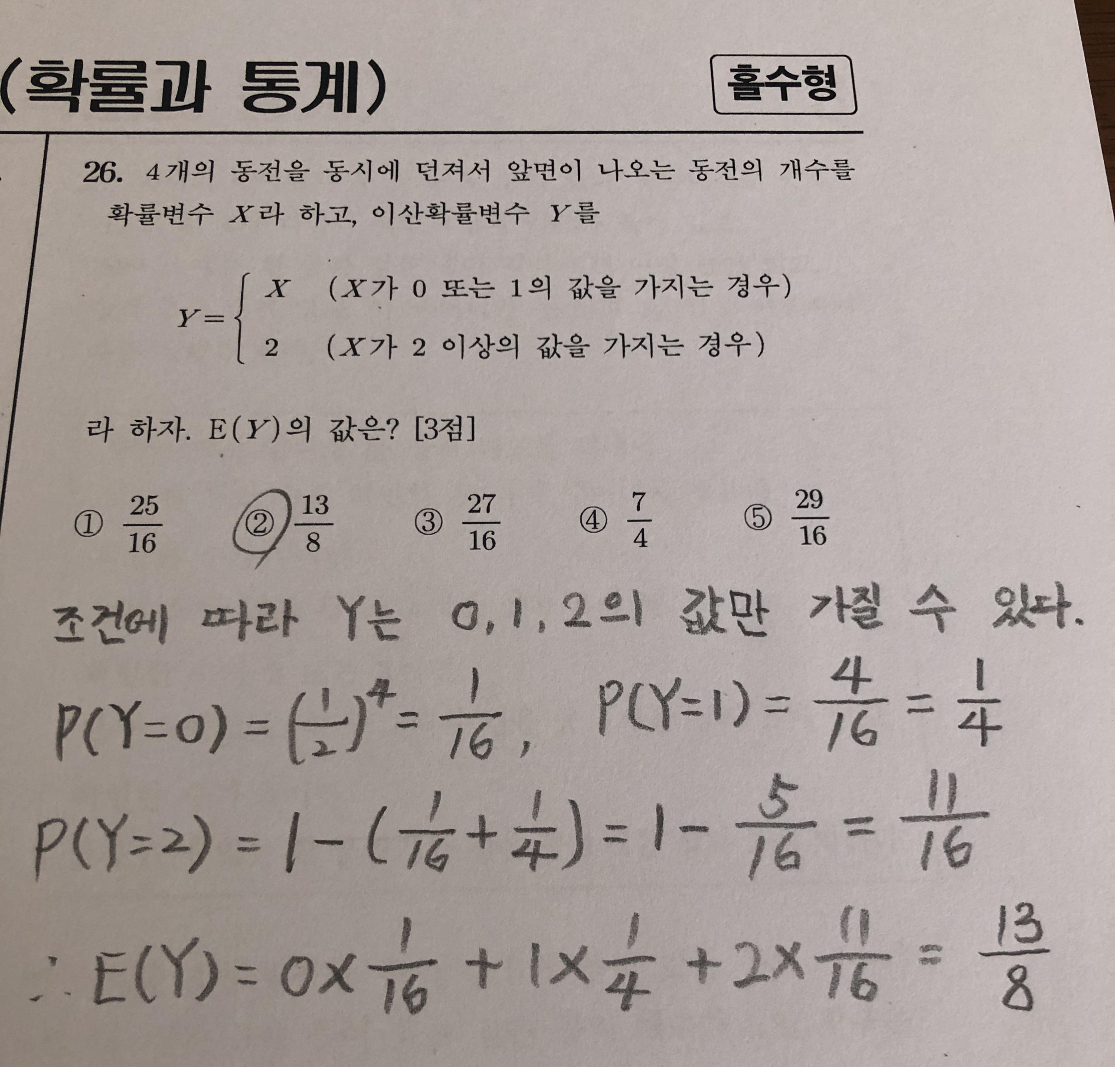 문제를 참 희한하게 꼬아 놓았습니다. 4개의 동전을 던졌을 때 앞면이 나오는 동전의 개수인 X는 0부터 4까지일 것입니다. 하지만 주어진 조건을 보면 Y는 0, 1, 2의 값만 가질 수 있습니다.