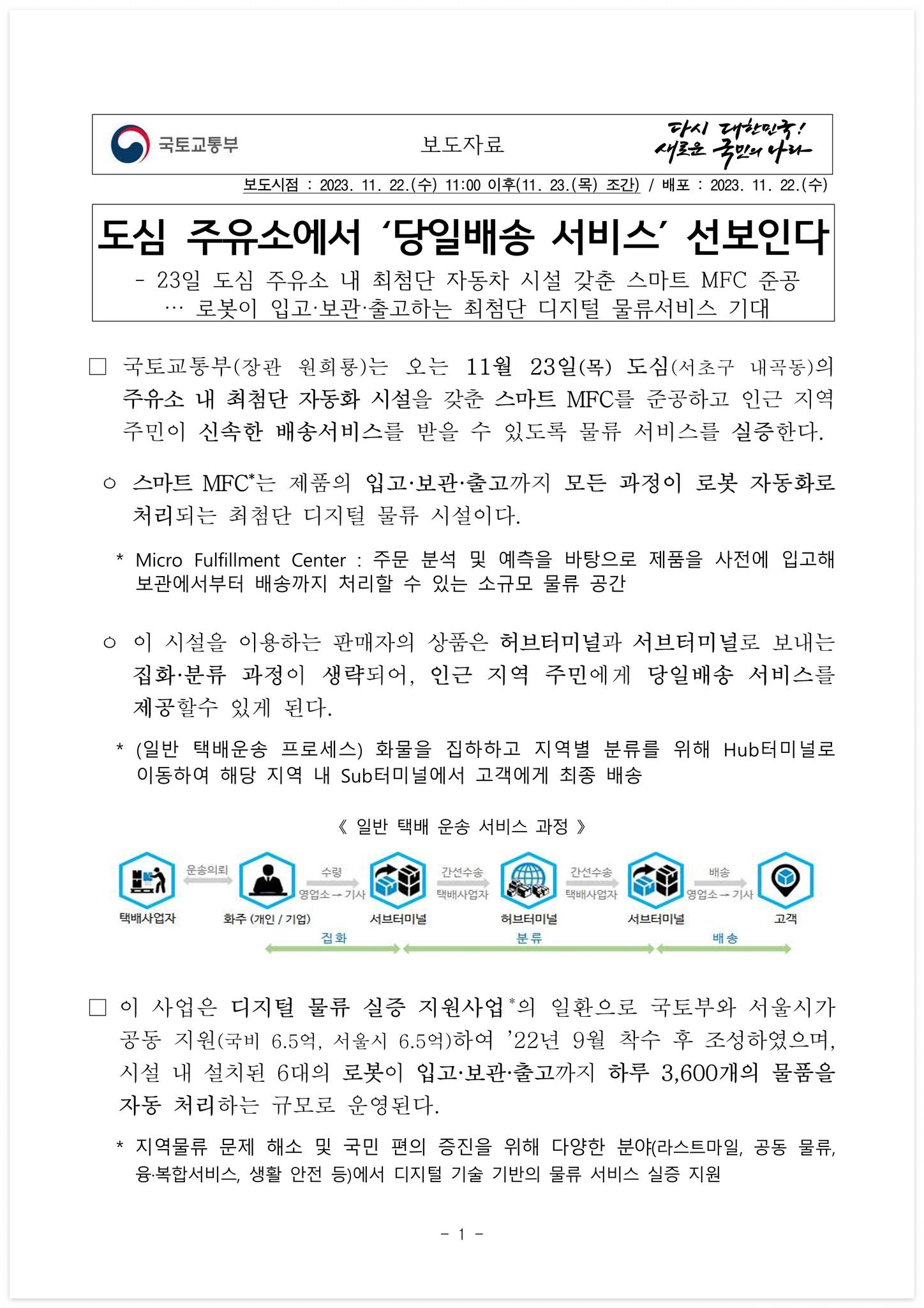 □ 국토교통부(장관 원희룡)는 오는 11월 23일(목) 도심(서초구 내곡동)의 주유소 내 최첨단 자동화 시설을 갖춘 스마트 MFC를 준공하고 인근 지역 주민이 신속한 배송서비스를 받을 수 있도록 물류 서비스를 실증한다.