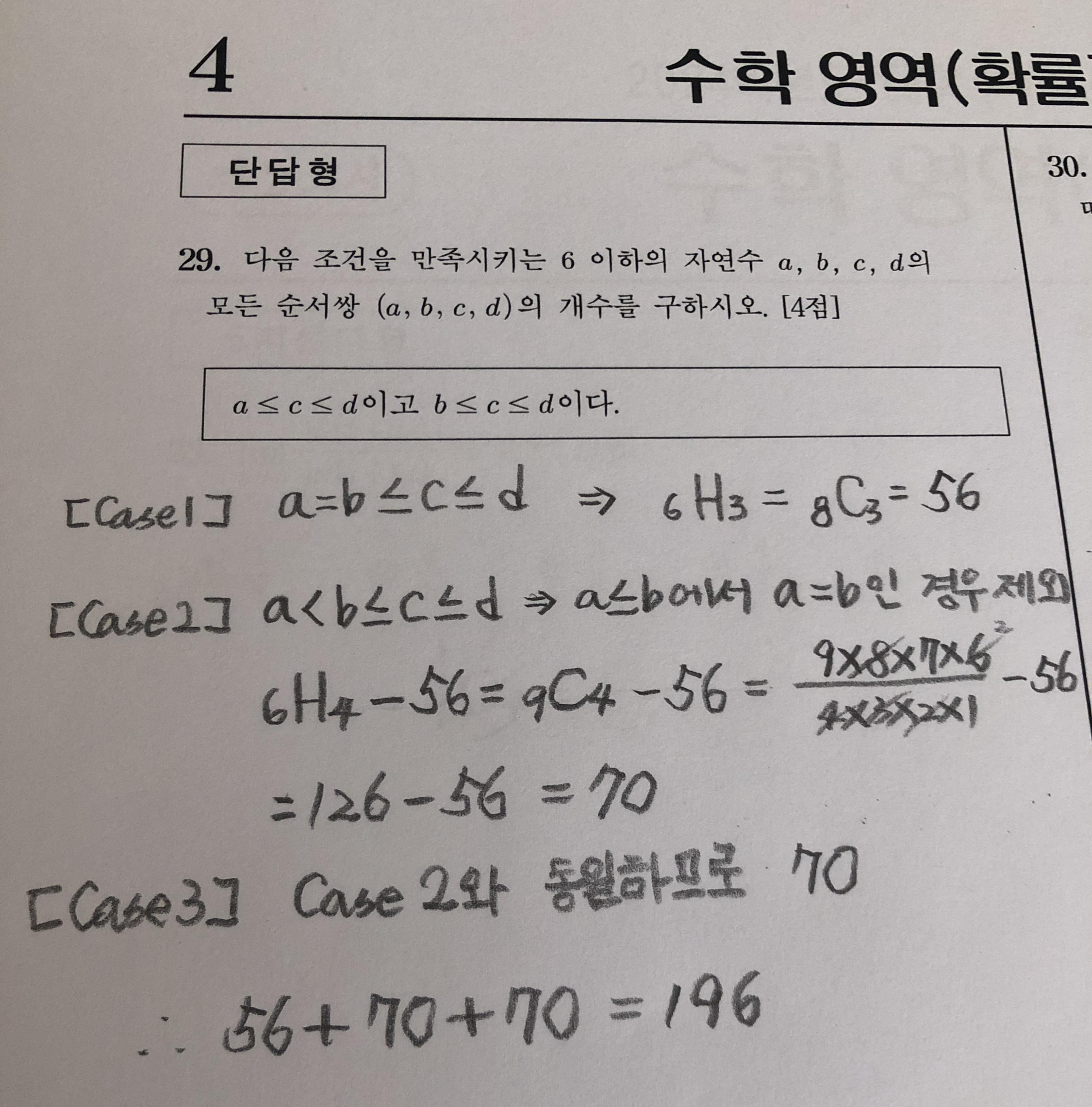 물론 저는 중복조합 공식이 기억나지 않아서 공식 찾아보고 비슷한 문제 풀어보고 나서야 이해하고 풀 수 있었습니다. 다시 한 번 말씀 드리지만, 저는 정답을 맞추기 위해 푸는 게 아닙니다. 그냥 수학이 좋아서 풀어보고, 못 풀면 공식이나 비슷한 문제 찾아보고, 그래도 모르면 쿨하게 정답 해설 보면서 공부하고 이해한 뒤에 정리합니다. 그냥 그게 좋아서 그렇게 합니다.