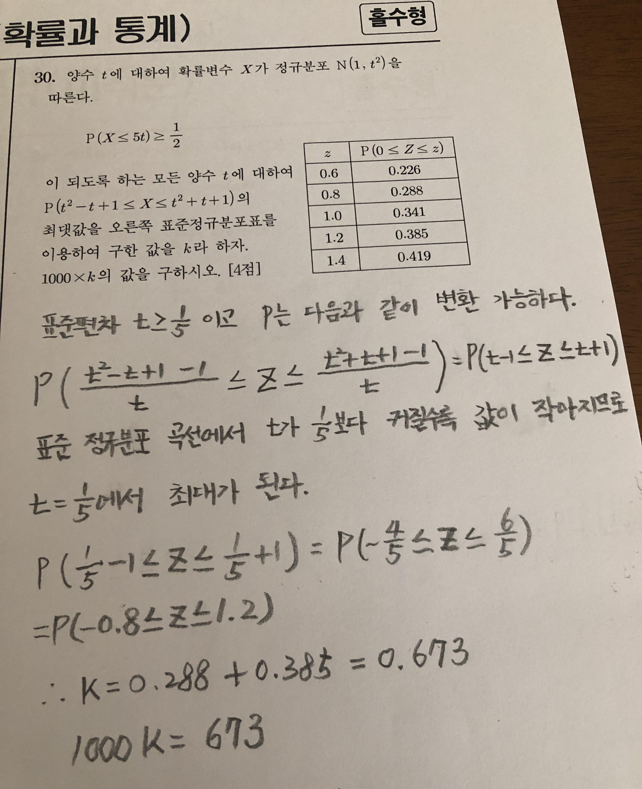 표준정규분포의 기본 개념만 알면 금방 풀리는 문제를 무려 30번 문제로 냈습니다. 그나마 너무 쉬울까봐 제발 실수 좀 하라고 1000을 곱한 값을 끄트머리에 묻고 있습니다.