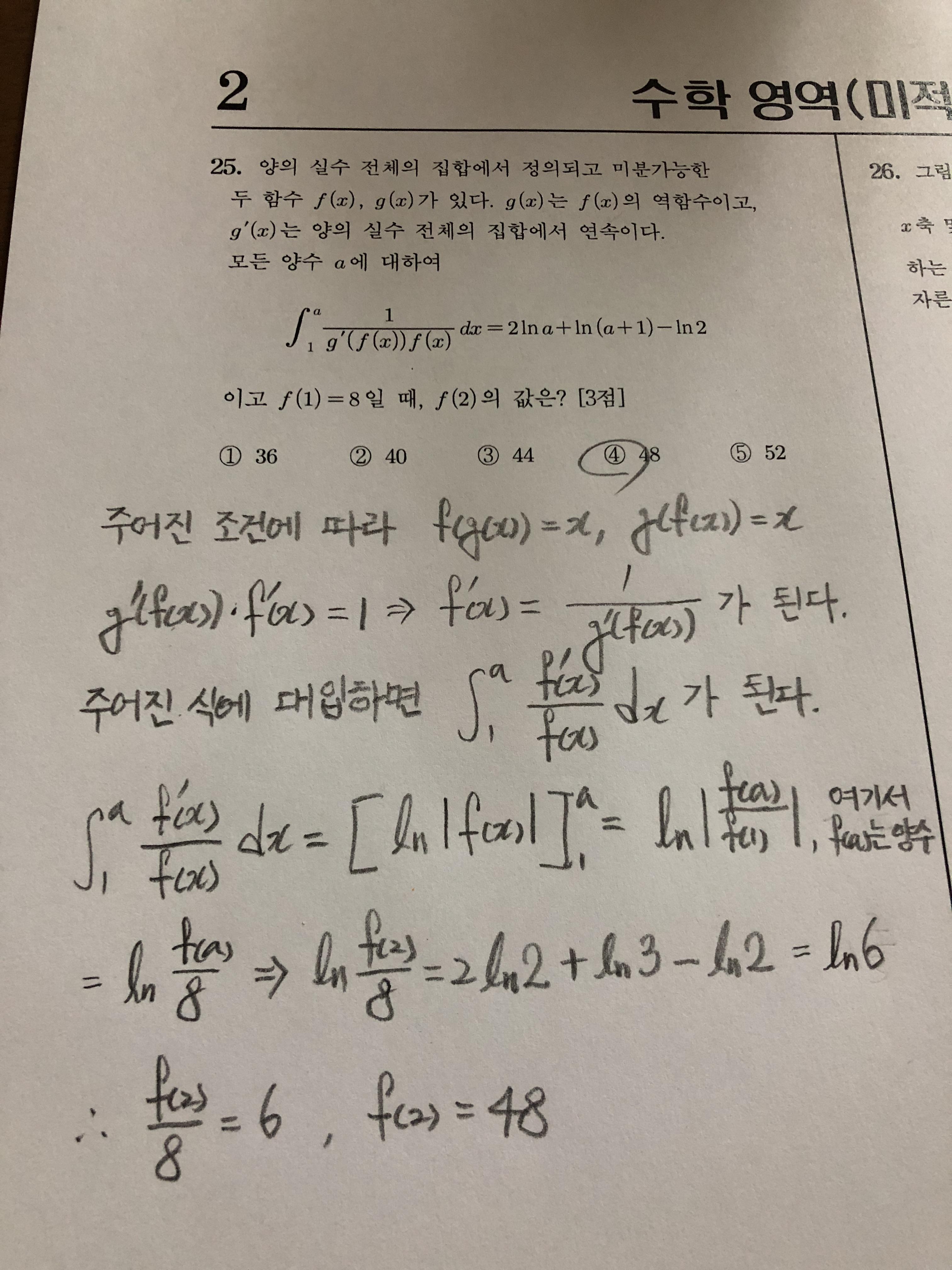 미적분 25번 문제입니다. 이 문제는 두 함수가 주어졌고 서로 역함수라는 조건이 주어졌습니다.