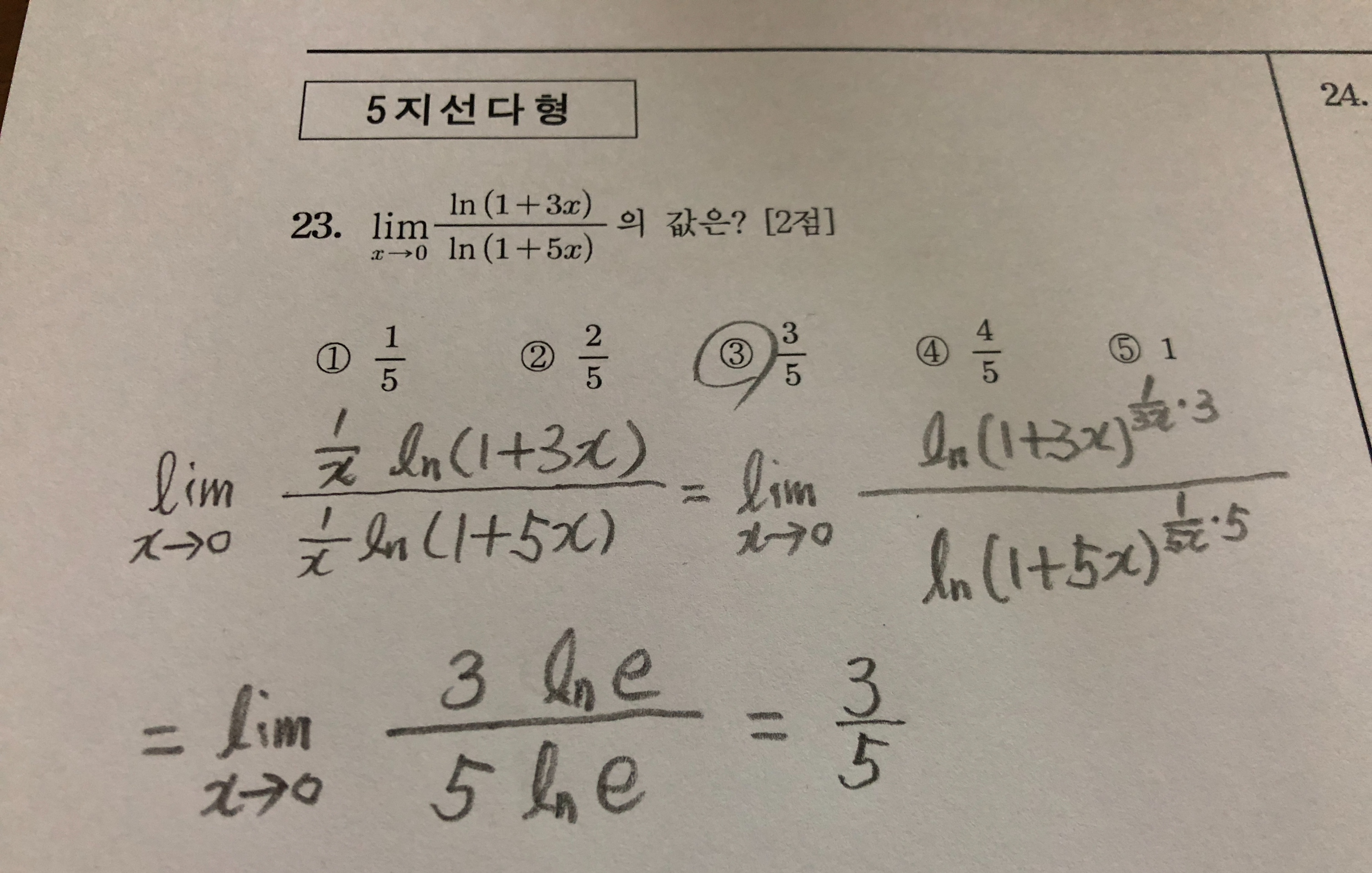 어쨌든 미적분 23번 문제는 자연로그의 극한 문제입니다. 이 문제는 얼핏 보기에 복잡해 보일 수도 있지만 결국 자연로그의 괄호 안을 지수와 함께 e로 만드는 것이 핵심입니다. 이것만 알면 쉽게 풀 수 있고, 모르면 절대로 못 풉니다. x의 계수가 3이든 5든 상관 없이 자연상수 e로 변환된다는 것을 알아야 합니다.