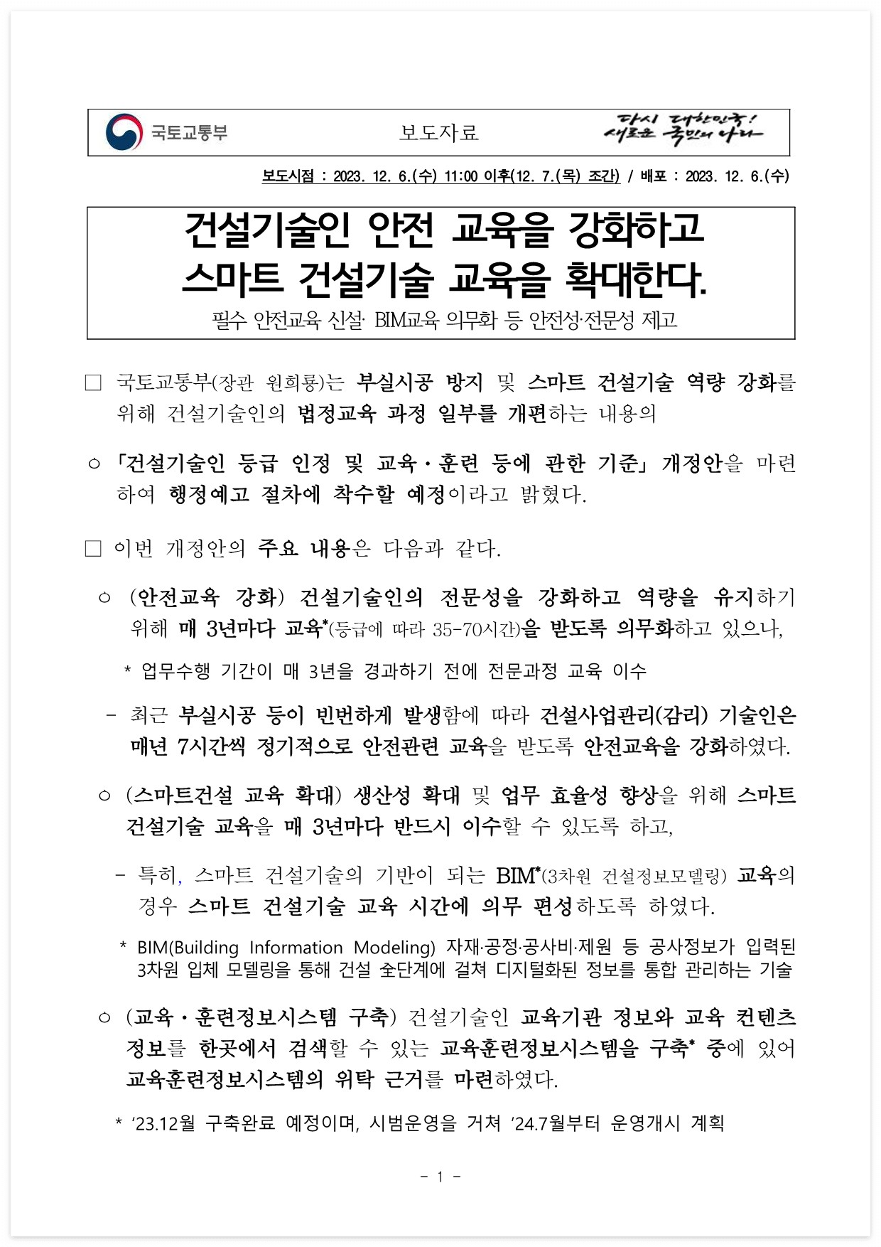 □ 자료 다운로드 : 231207(조간)_건설기술인_안전_교육을_강화하고_스마트_건설기술_교육을_확대한다(기술정책과)