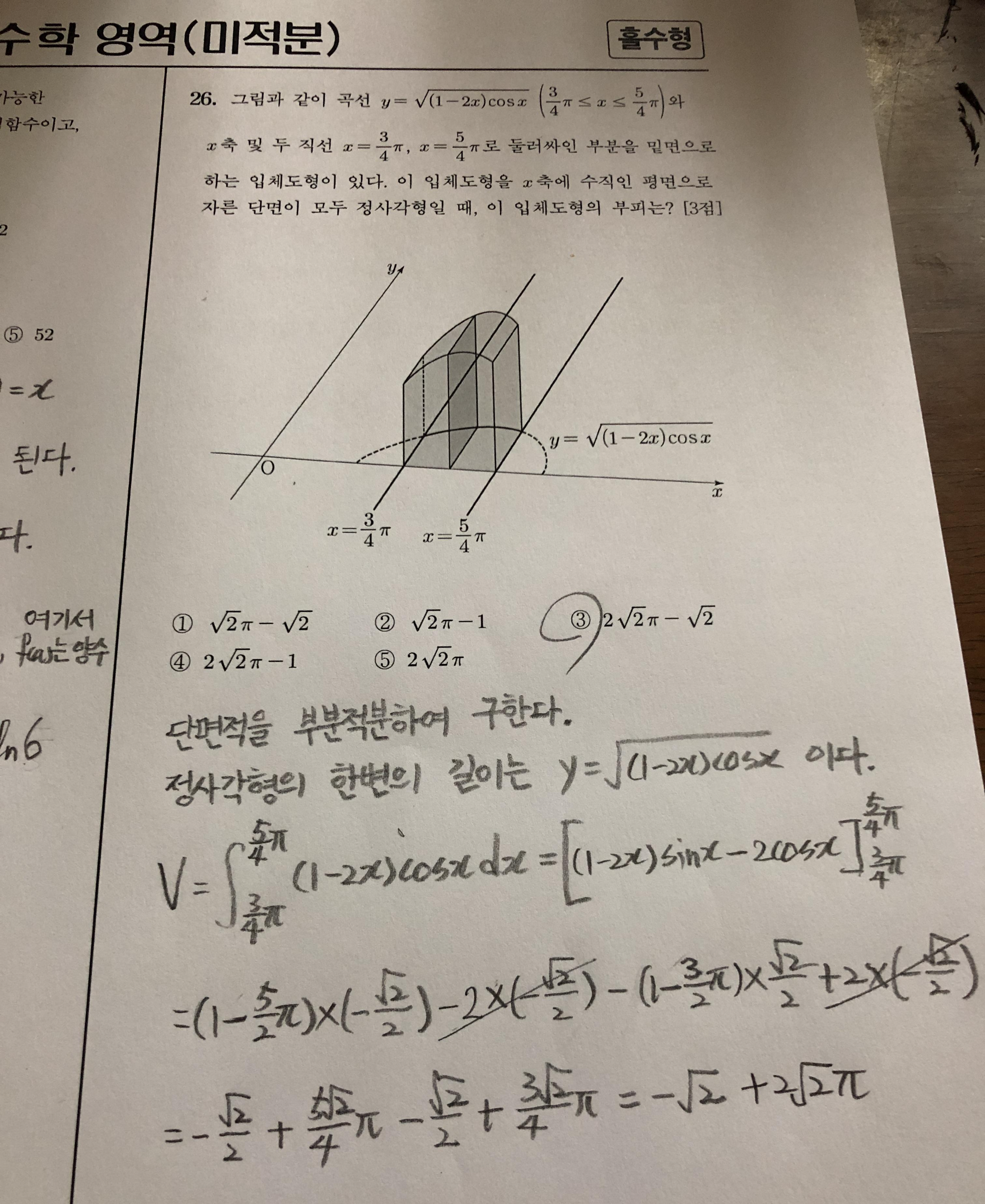 23번 문제는 작년과 비슷한 문제가 있었습니다. 시각적으로 복잡할 뿐 원리는 간단합니다. 체적 내부에 있는 정사각형 단면의 한변의 길이가 변수가 포함된 함수일 뿐입니다.