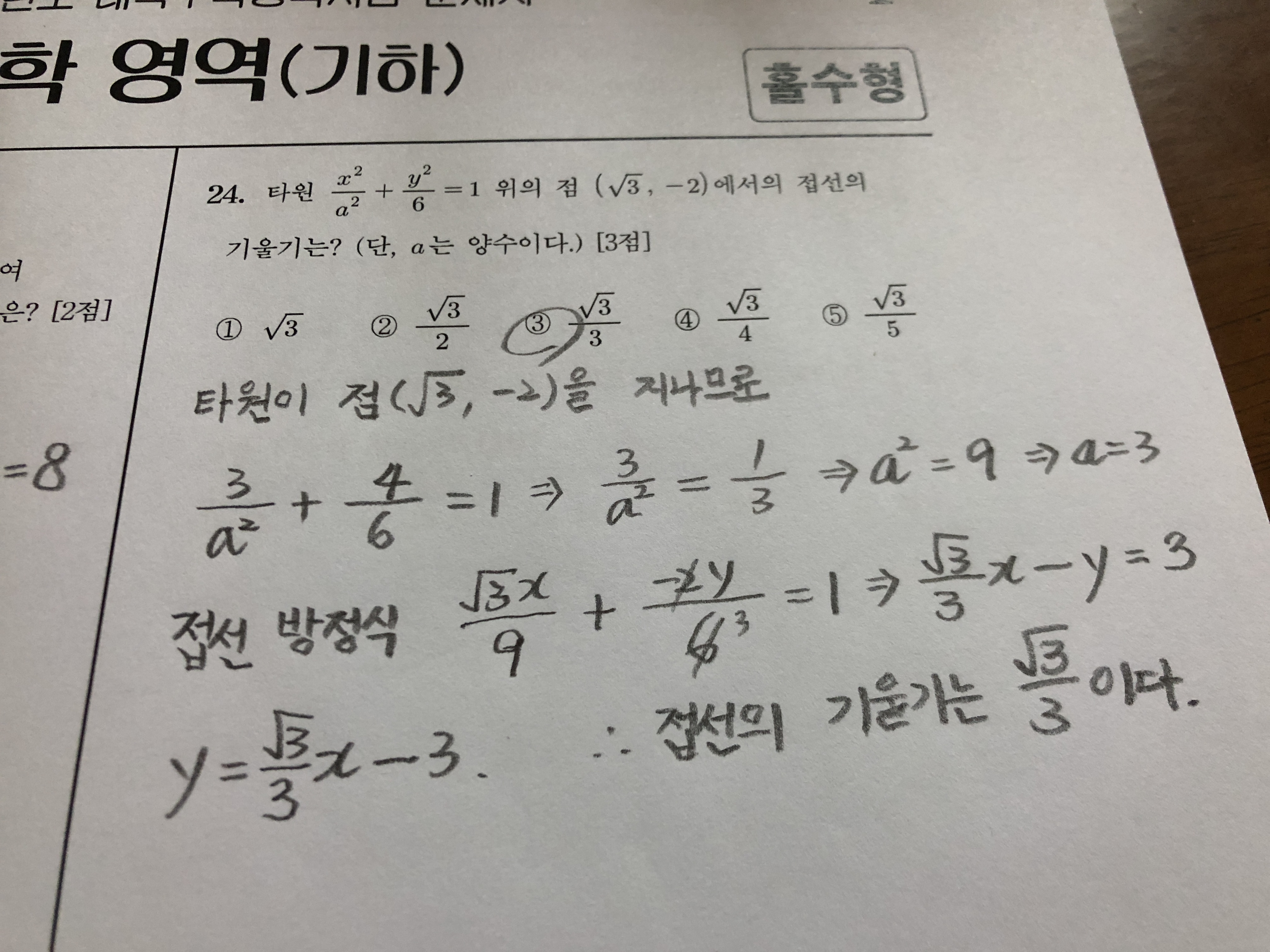 타원이면 접선의 방정식도 알아 두어야 합니다. 타원 방정식에 접점만 넣으면 되니 쉽습니다. 식을 정리하면 기울기는 금방 구할 수 있습니다.