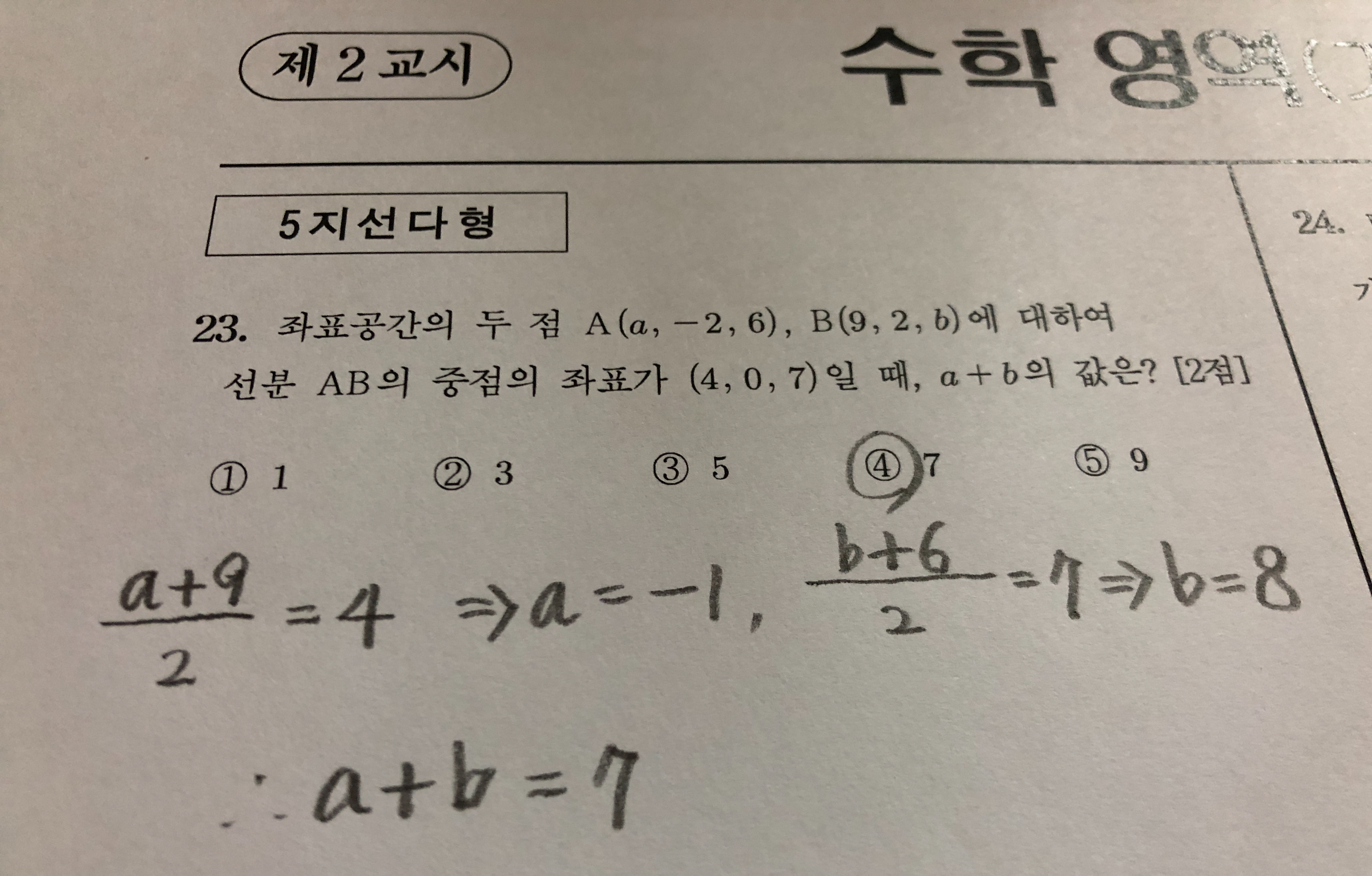 23번 문제는 사실 중학교 수학 정도의 수준인 것 같습니다. 두 점 사이의 거리의 중점 좌표가 주어졌으므로 x 좌표와 z 좌표의 평균값으로 구하면 됩니다.