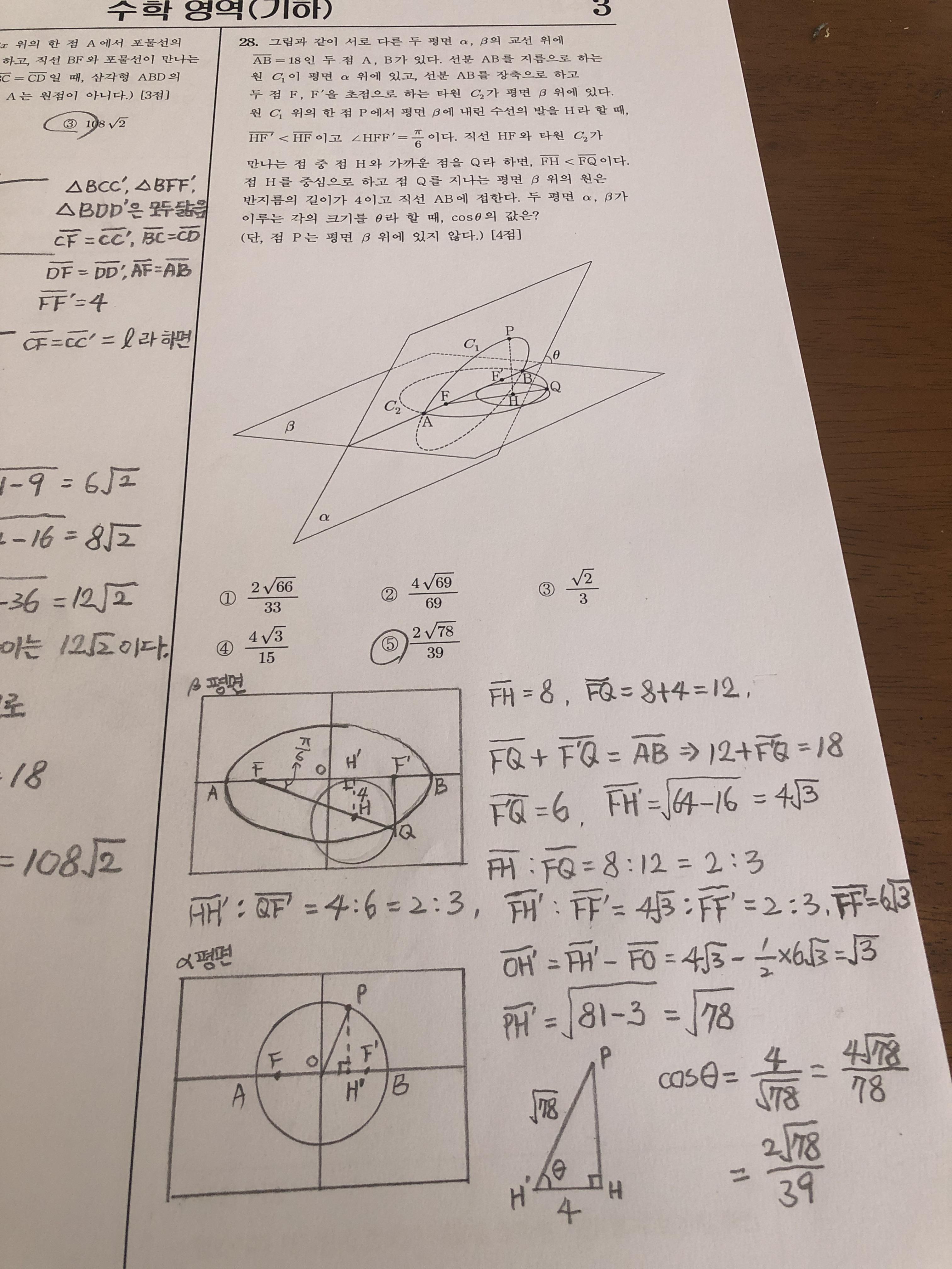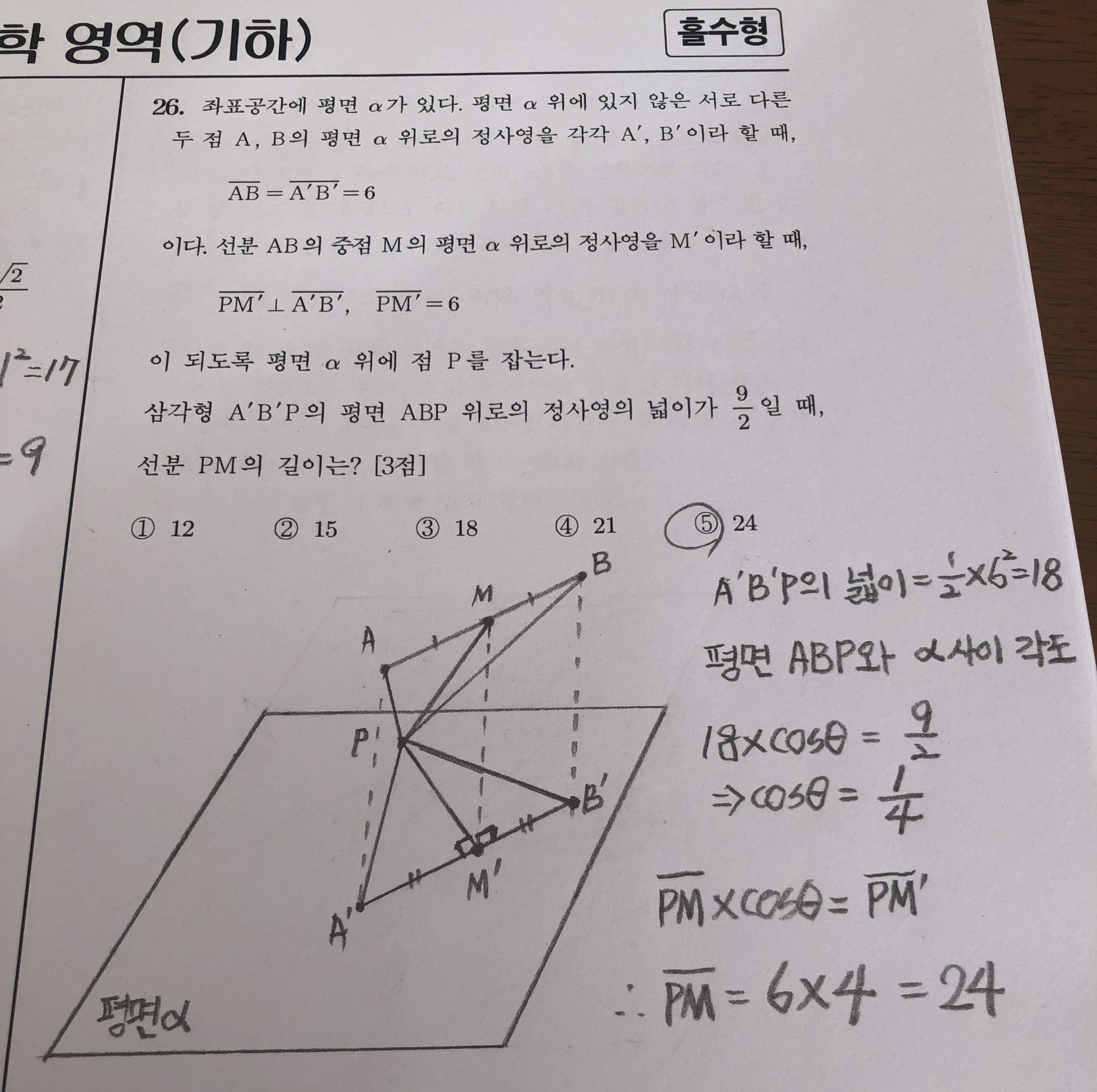 그리고 나서 기하에서 평면 문제의 핵심은 뭐다? 바로 평면들 사이의 각도 문제입니다. 어김없이 여기서도 cosθ를 구하라고 합니다. 우리는 PH'과 HH'의 길이를 구해놨으므로 쉽게 cosθ를 구할 수 있습니다.