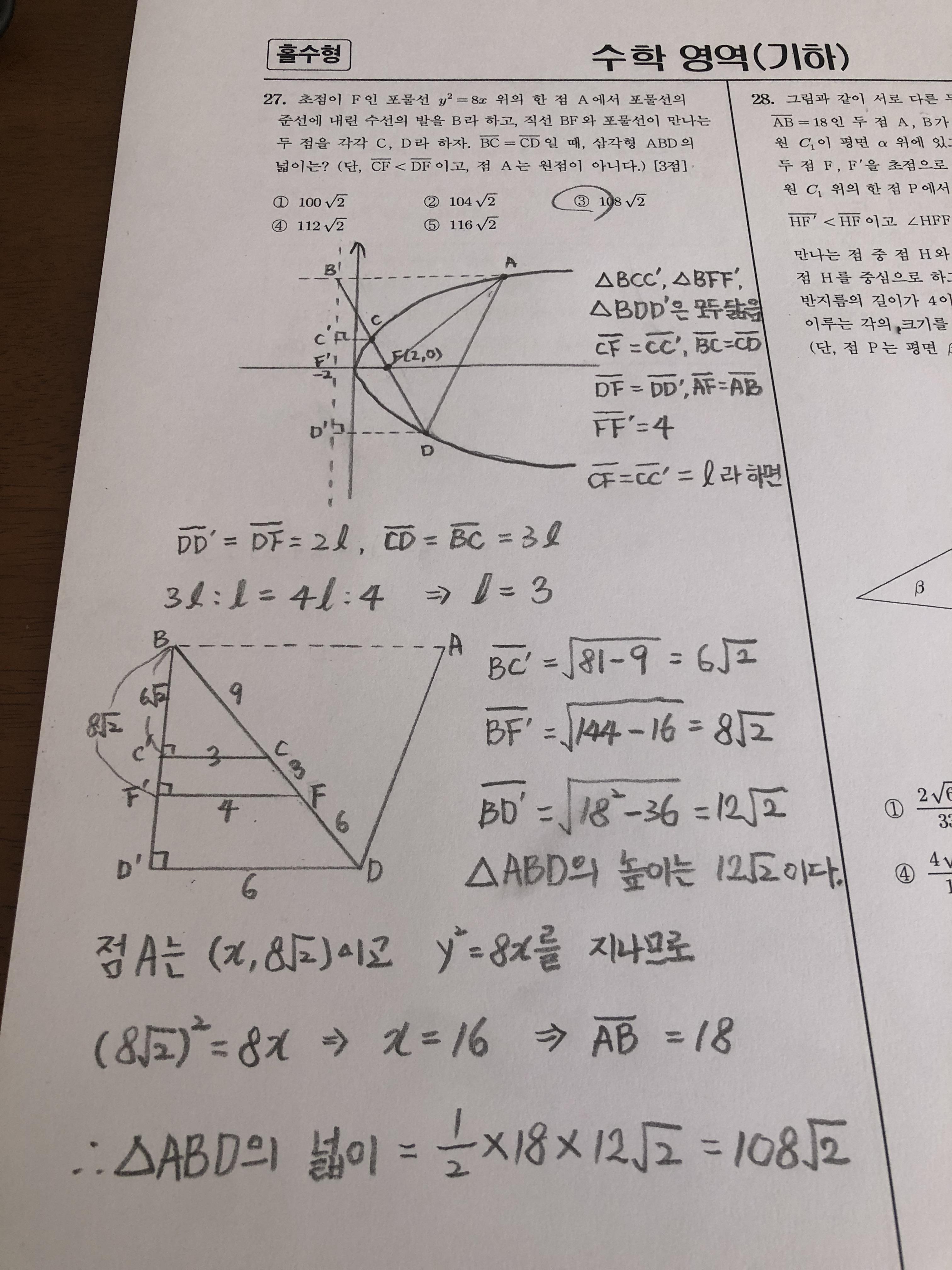 기하 27번 문제입니다. 포물선 문제가 나왔습니다.