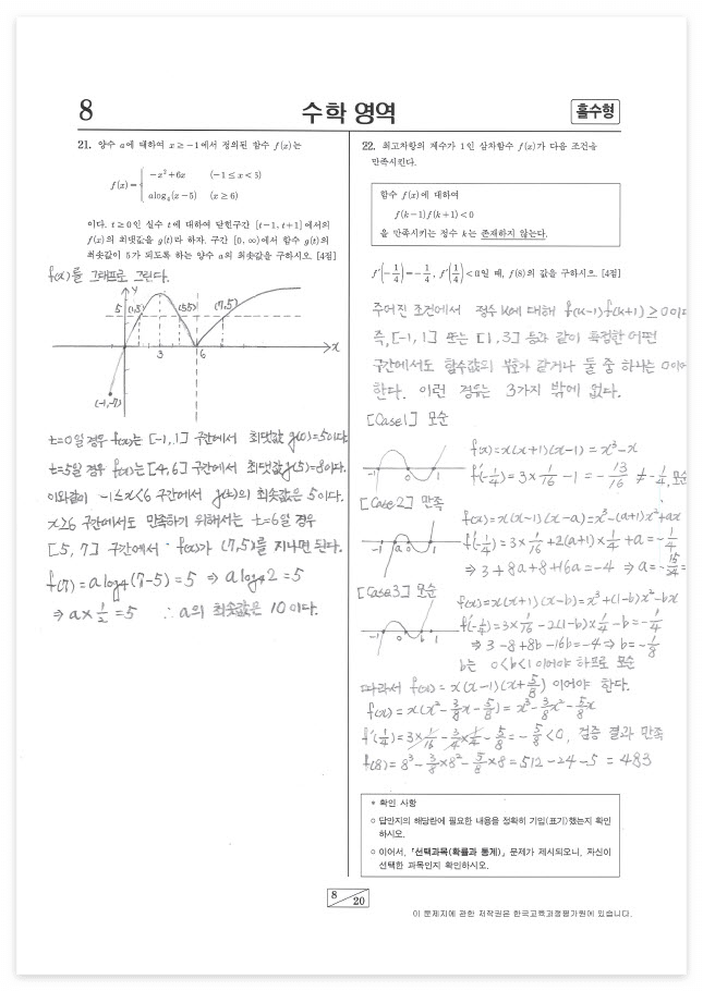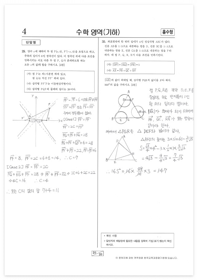 공통 문제의 난이도가 많이 높아졌고 미적분이 확률과 통계와 기하에 비해 어려웠습니다. 가만히 보니 출제 위원들은 합성함수와 매개변수를 참 좋아하는 것 같습니다. 미적분 문제는 기하로 직접 그려봐야 이해할 수 있는 문제가 대세인 것 같습니다.
